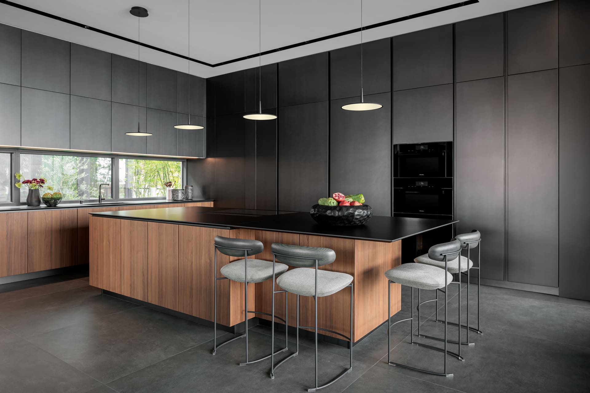 STRANG addressed this condition through a custom lighting solution in the dining area, where a constellation-like arrangement of small fixtures replaces more conventional ceiling treatments. In the kitchen, slender pendant lights provide functional illumination without competing with the architecture. These interventions allow the ceiling plane to remain visually light while accommodating significant structural requirements, demonstrating how design constraints informed, rather than compromised, the final outcome.