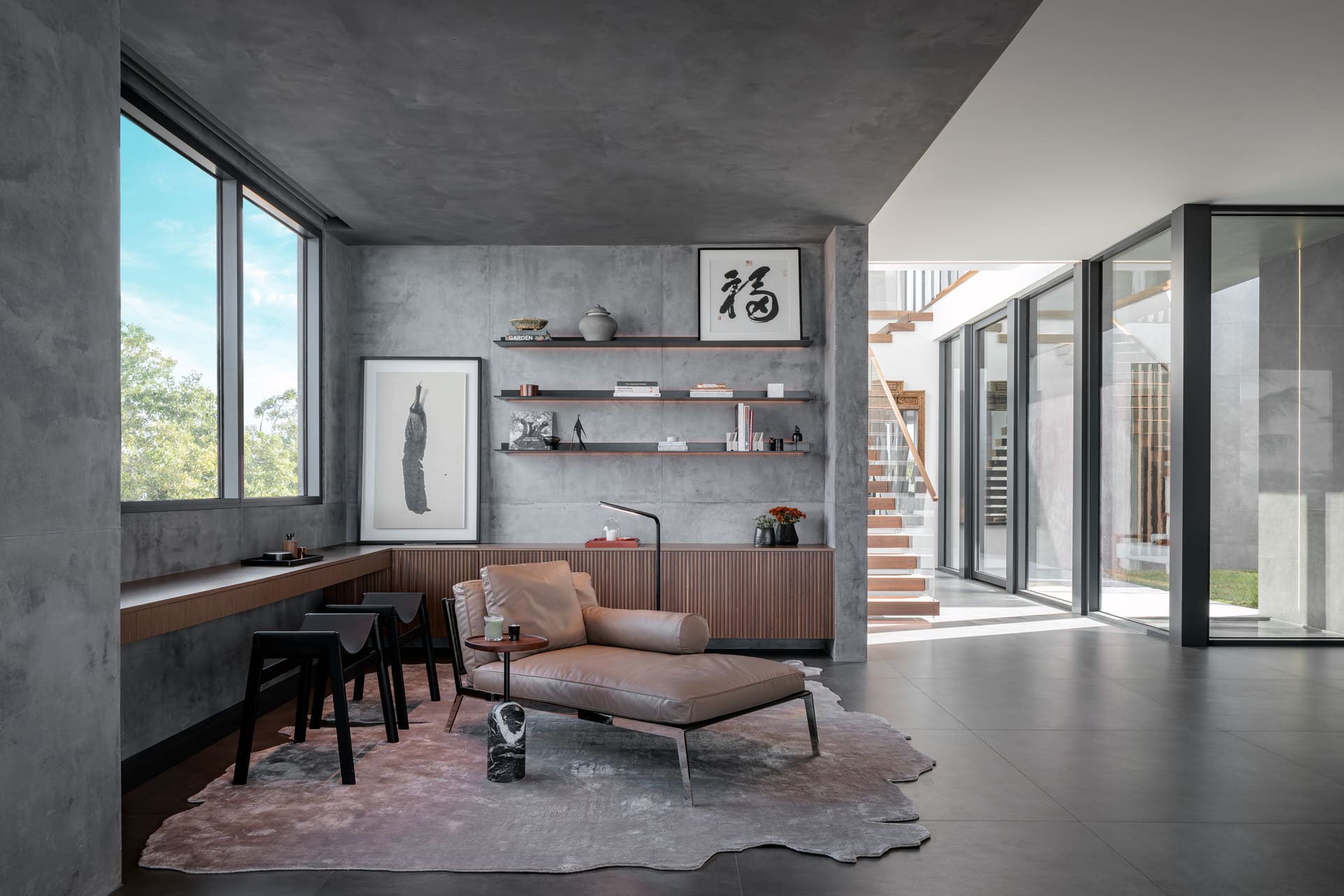 Lighting is used as an architectural tool rather than a purely decorative element. Integrated lighting systems are embedded throughout the structure to articulate volumes, emphasize material transitions, and support different modes of inhabitation throughout the day. This approach becomes especially evident in response to one of the project’s key technical challenges: the incorporation of large structural beams required to support an extended cantilever. The structural demands limited ceiling plenum space, creating constraints on traditional mechanical and lighting systems.