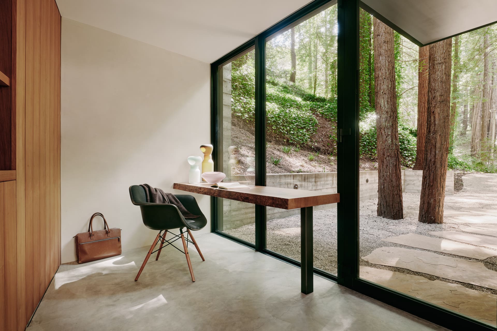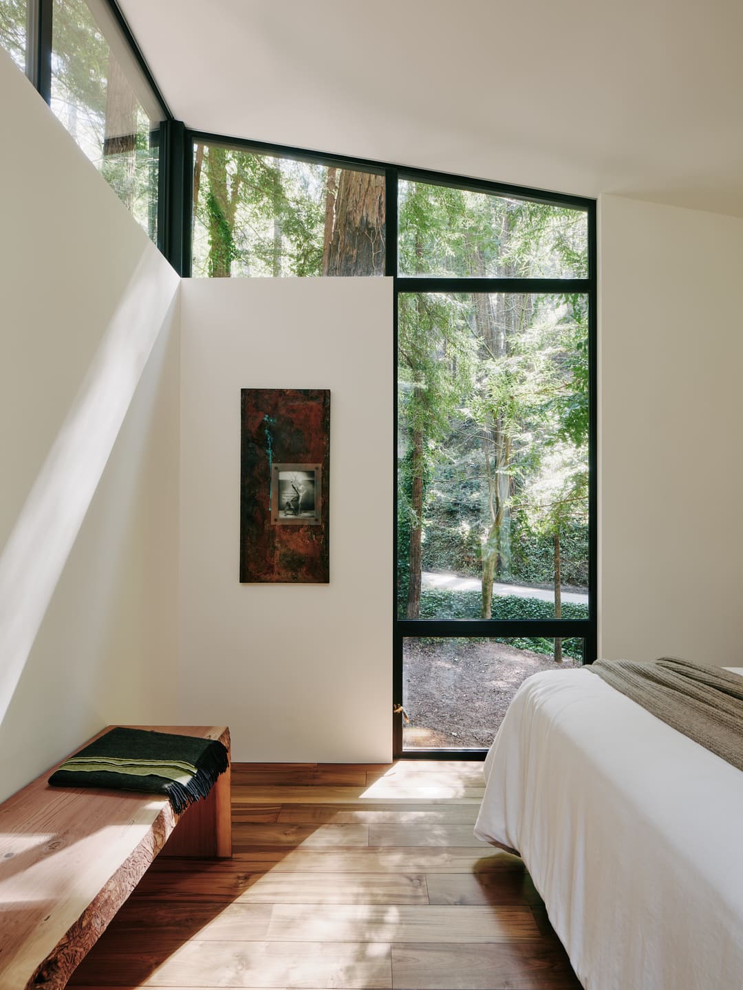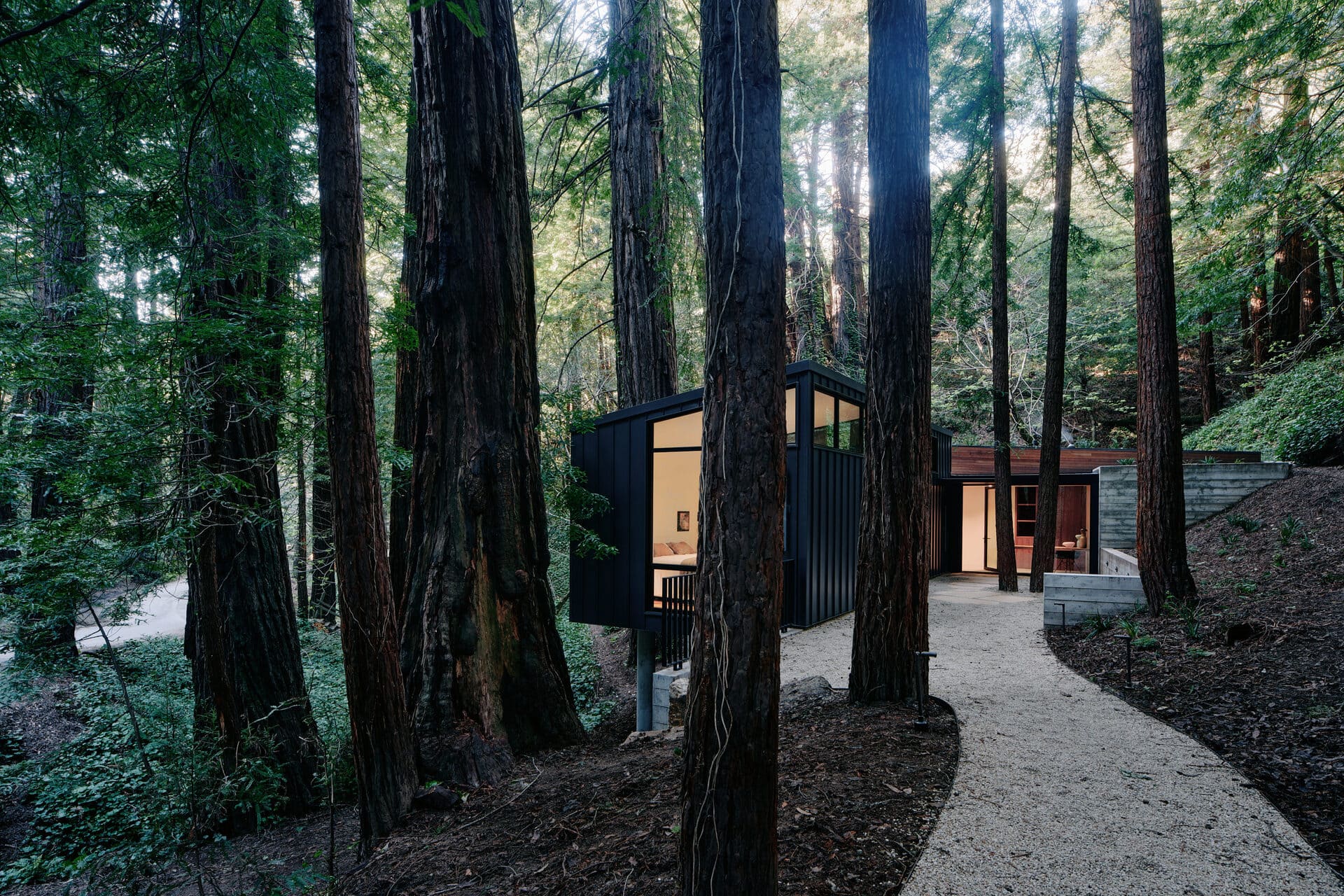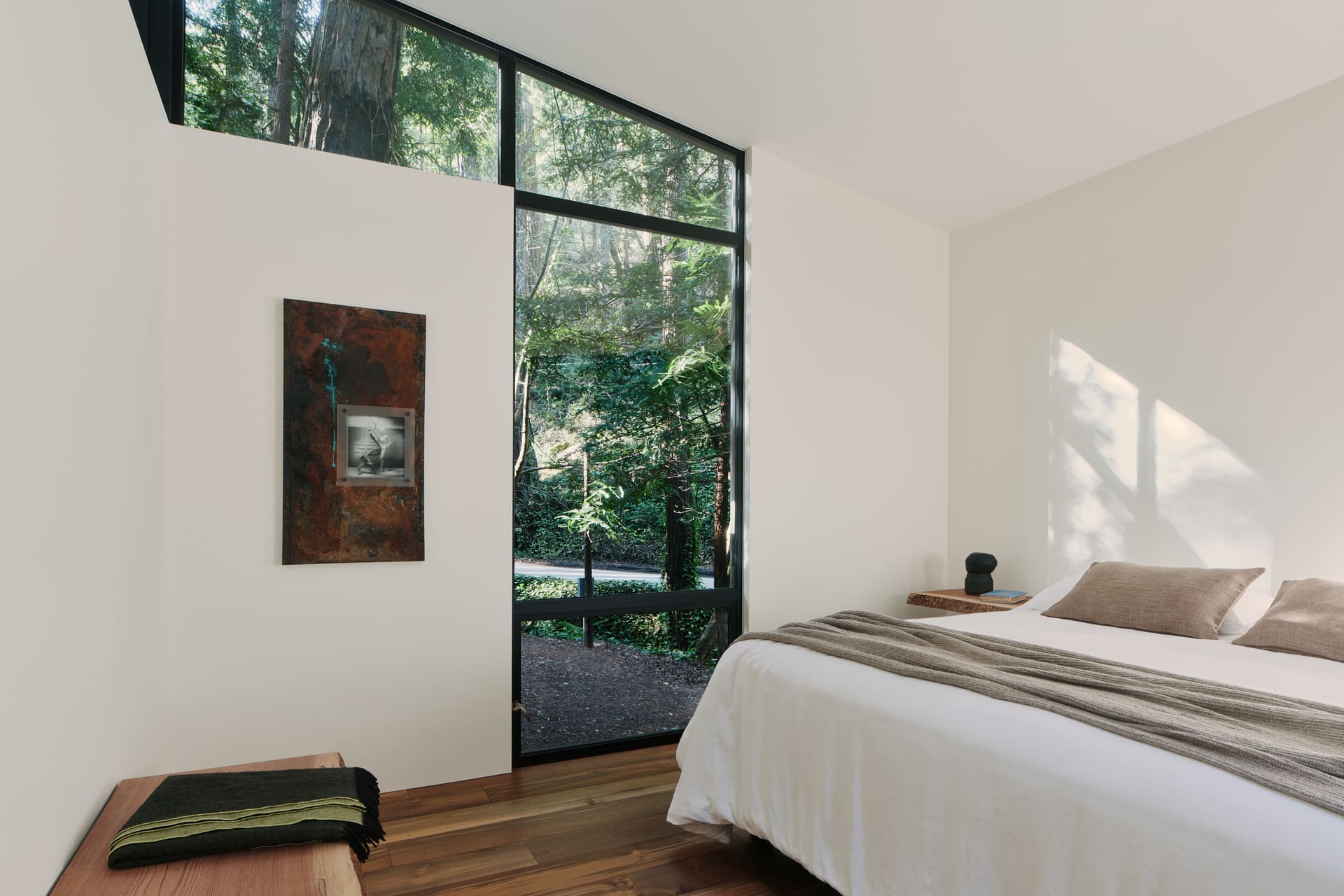 Interior spaces emphasize clarity and connection to the outdoors. The great room serves as a central gathering space, open to light and views through floor-to-ceiling windows. The bath pavilion and bedroom suite are more private, but each maintains a relationship with the forest through dedicated patios. The use of redwood throughout provides a cohesive material language, linking interior and exterior while reflecting the surrounding woods.