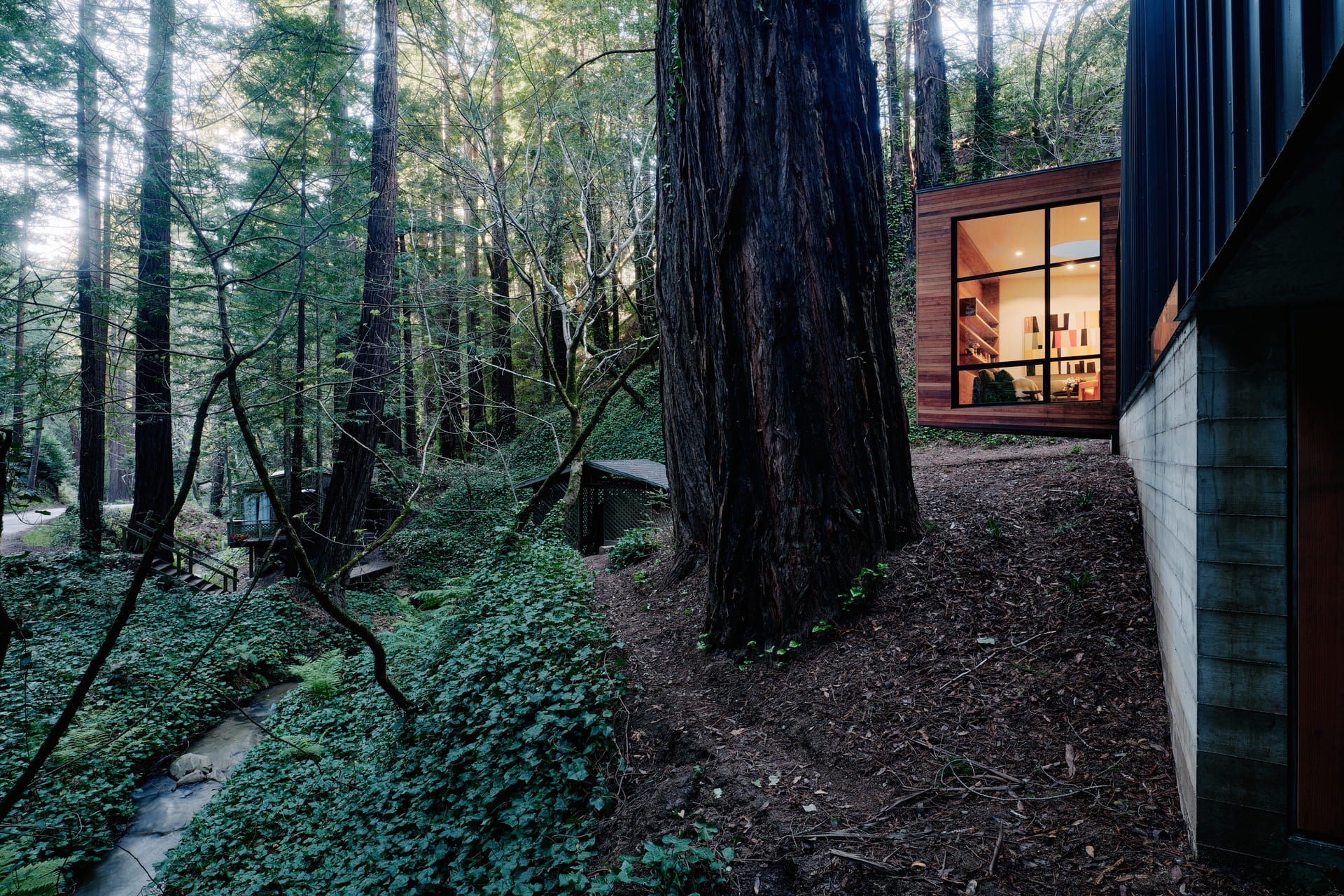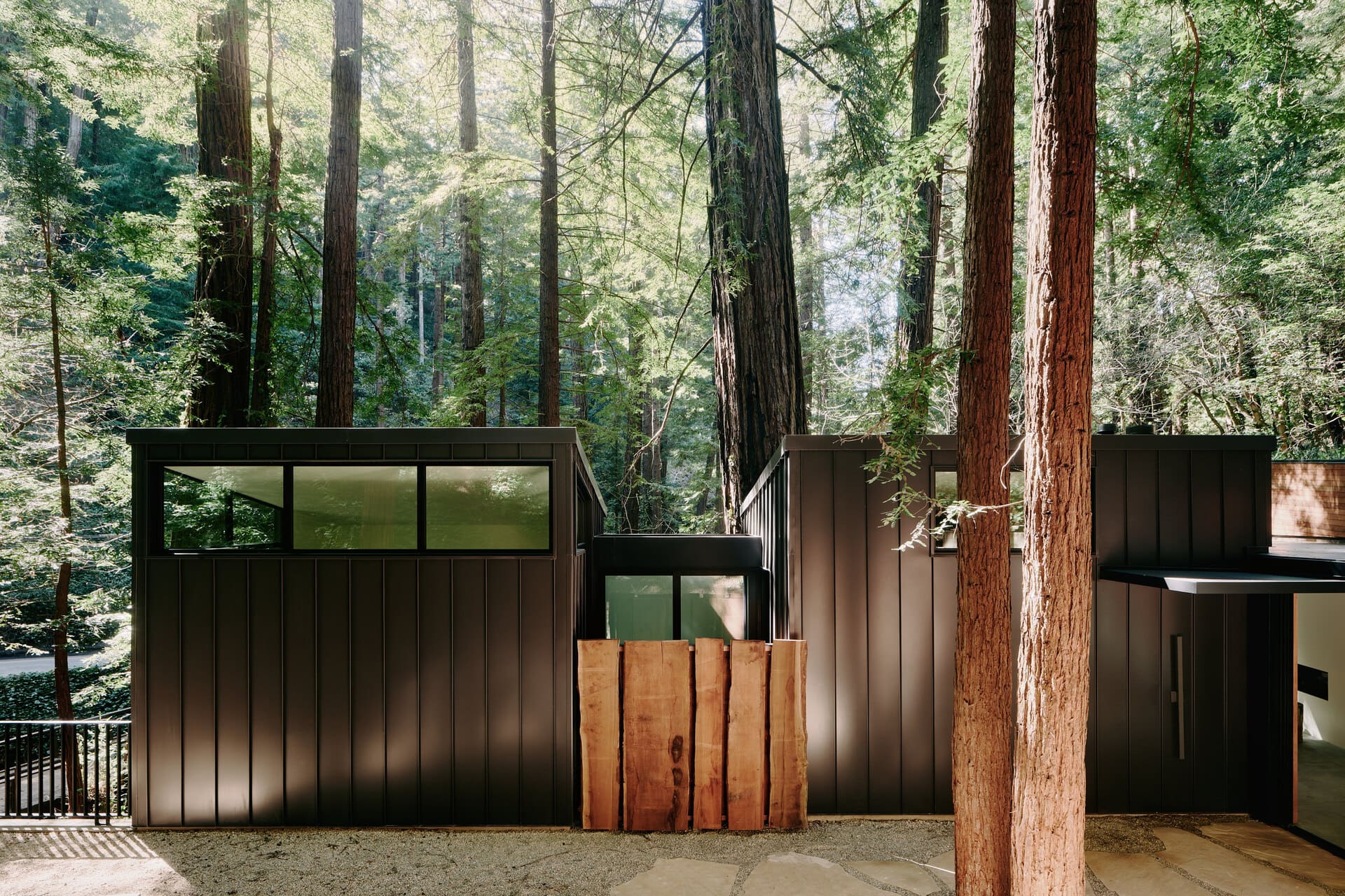 The structure is organized into three distinct volumes – the great room, a bath pavilion, and the bedroom suite – each with its own private patio. This configuration separates functions while maintaining visual and spatial connections to the forest. The choice of materials reinforces this integration: all siding, wall paneling, and cabinetry are crafted from locally sourced reclaimed redwood, giving the home warmth and texture while echoing the region’s natural heritage.