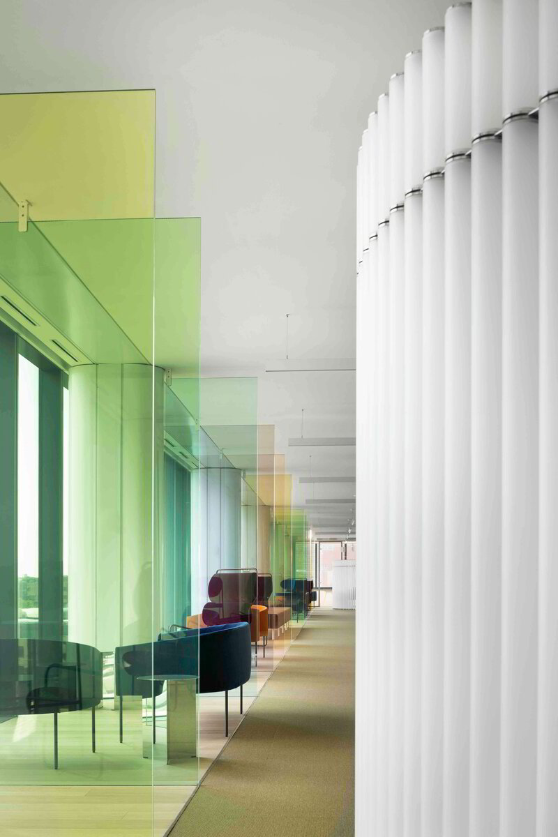 The spaces created for the primary functions of a working facility (single and open offices, meeting rooms, conference rooms and so on) alternate with many lounge and break areas, as well as personalized corners that adapt to the relational needs of the moment.