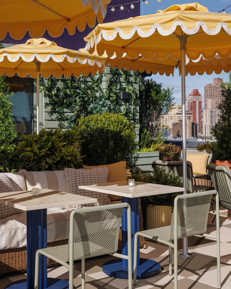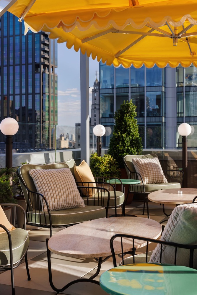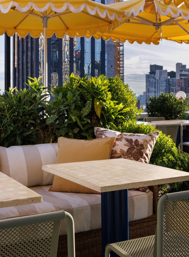 The design’s chromatic language feels particularly deliberate. Muted sage greens and sun-washed yellows establish a palette that nods to the city’s architectural patina while infusing the terrace with an understated warmth. This tonal restraint is enlivened by tactile flourishes: painted pavers, textural plantings, and terrazzo-topped tables by Concrete Collaborative. Chairs sourced from Beam and luminous fixtures from Schoolhouse punctuate the space with layers of visual rhythm, their finishes balancing the raw with the refined. The effect is immersive yet effortlessly approachable – a rare equilibrium between precision and play.