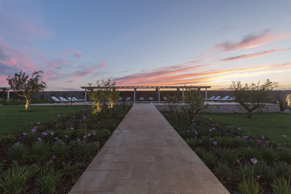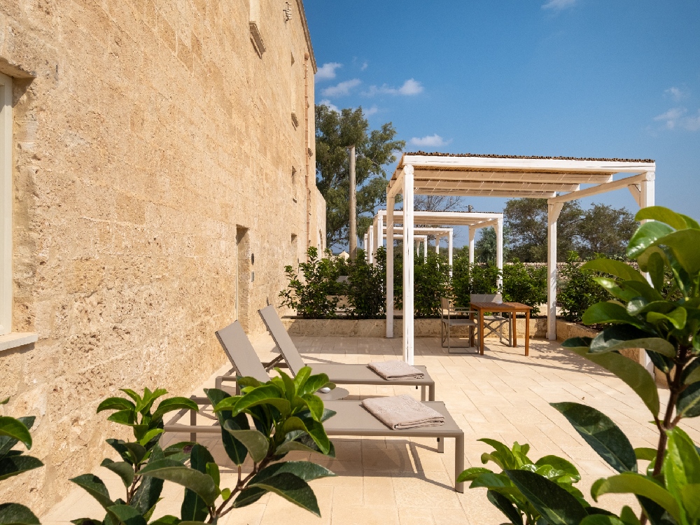 Outside, nature takes centre stage. Reed pergolas and wooden beams provide shade, while oversized ceramic jars and handcrafted woven straw lamps lend a touch of rustic elegance. The landscape, designed with water conservation in mind, is a curated tapestry of succulents and Mediterranean flora that harmonise effortlessly with the Salento environment.