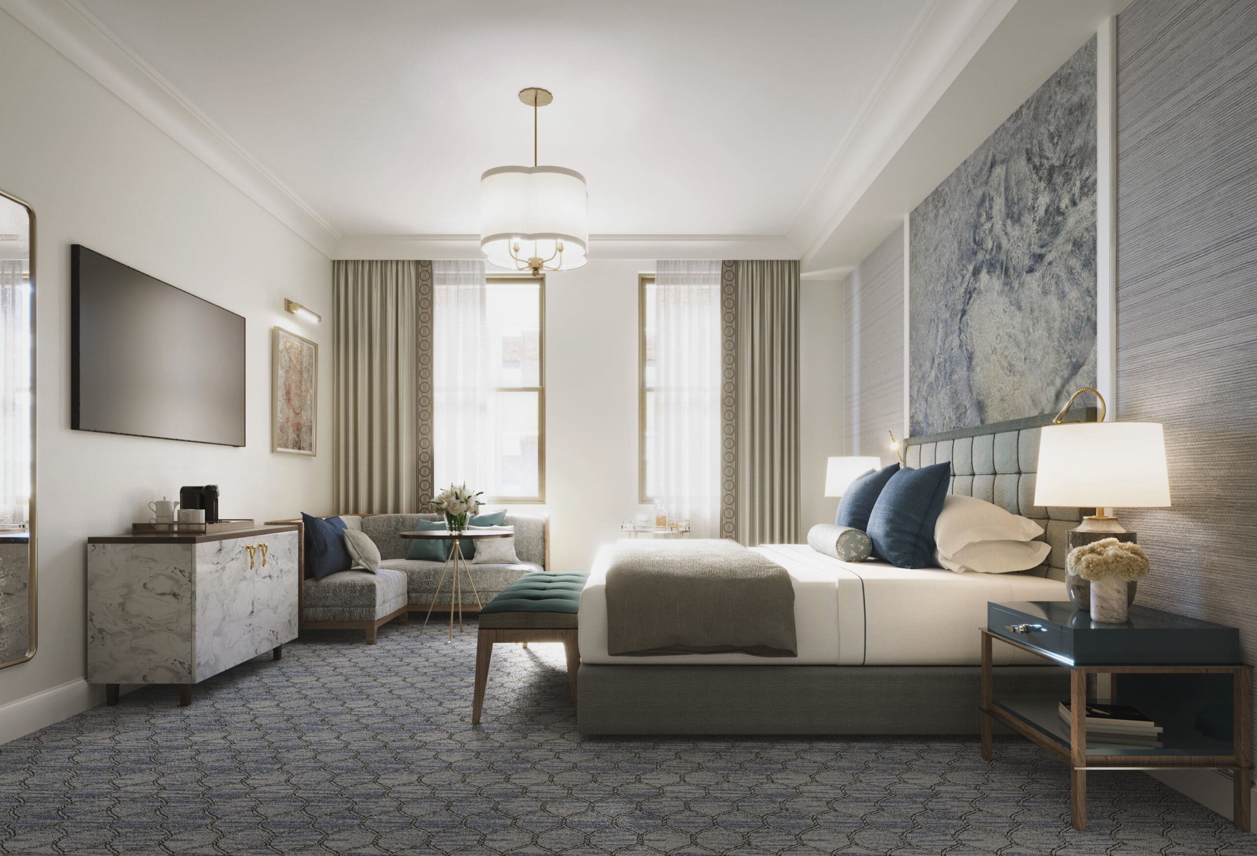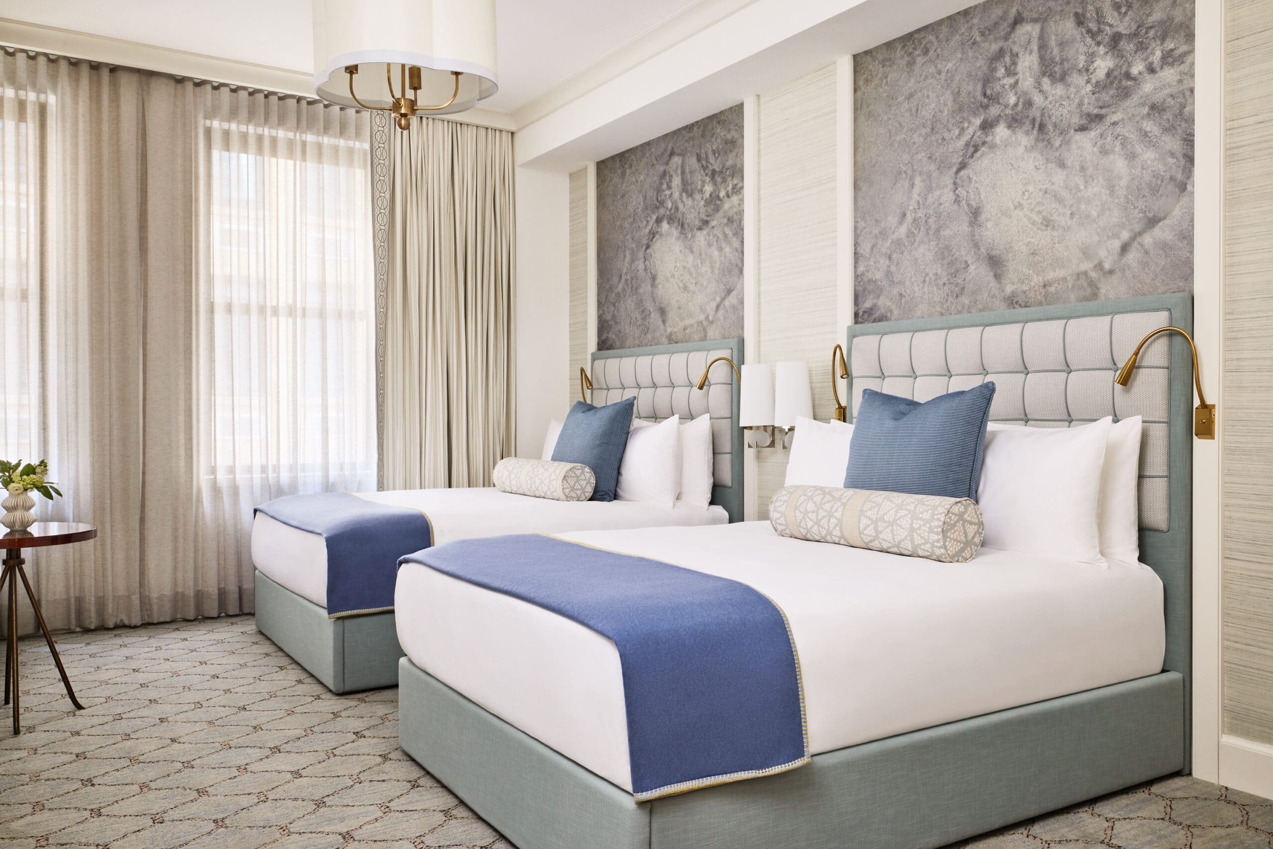 Architecturally, the project is measured rather than flamboyant. The restoration, with architecture by Stonehill Taylor, interiors by Rose Ink Workshop and signature restaurant design by Charles & Co, retains the dignity of the early twentieth-century façade, while interior designer Liubasha Rose has created rooms that feel quietly composed, more domestic than ostentatious. The hotel’s 180 rooms vary in configuration – a legacy of the original structure – and are decorated in soft shades of grey and blue with subtle references to the family’s maritime heritage. There is craftsmanship here, but it is intended to soothe rather than impress.