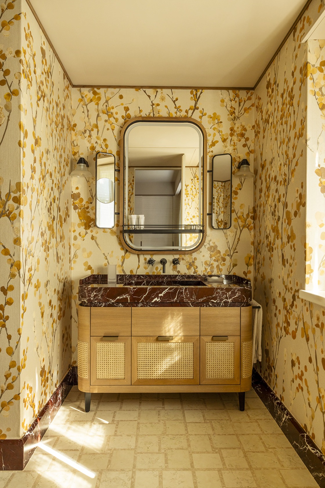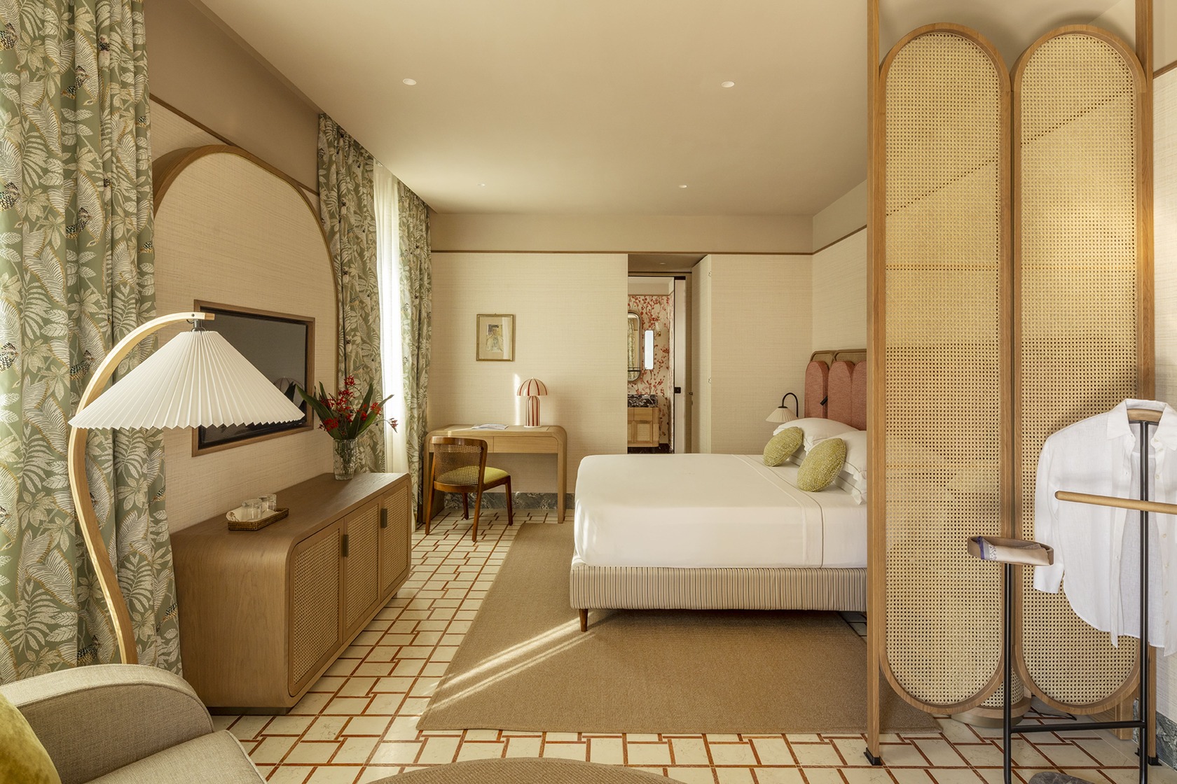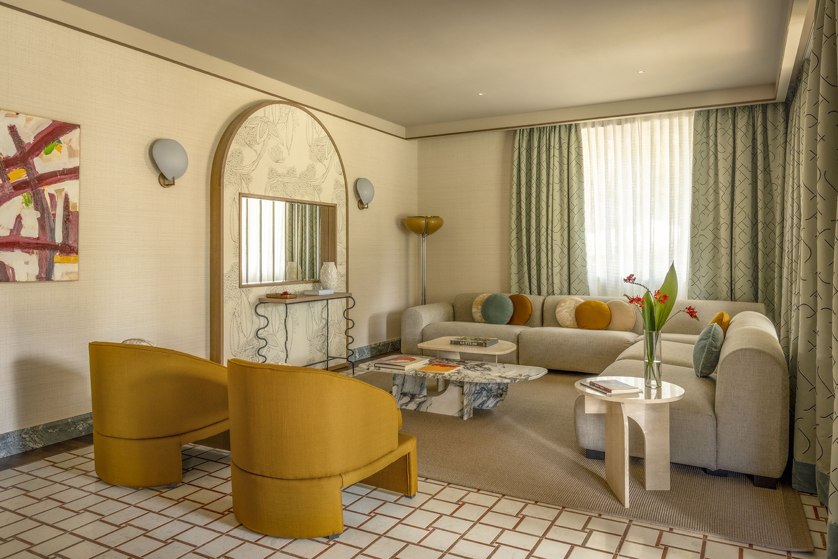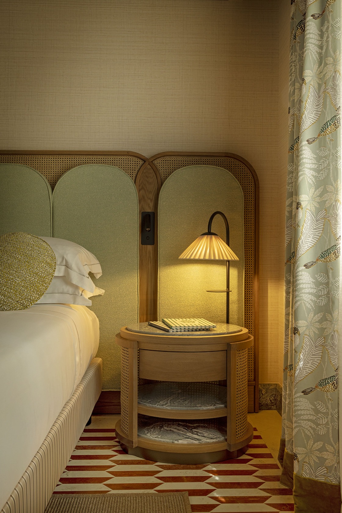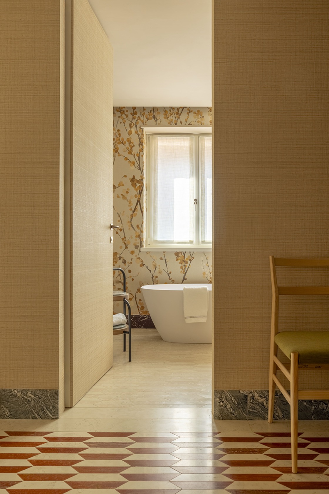 In the luminous living area, a grand custom table anchors the space beneath a vintage Barovier & Toso chandelier from the 1930s–40s, an emblem of Venetian craftsmanship. Just steps away, the iconic Quadrifoglio floor lamp, designed by Gae Aulenti for Guzzini in the 1970s, brings a sculptural modernist contrast that integrates effortlessly with the space’s warm materiality. Even transitional areas – often overlooked in residential design – become showcases of intention: the stairwell, for instance, is graced by a Vico Magistretti table for Cattelan (1980), its travertine base and crystal top evoking a play of solidity and lightness that feels emblematic of the project’s ethos. The suites continue this interplay of heritage and innovation. Each is conceived as a unique environment where the palette – drawn from nature’s own lexicon of leafy greens, sea blues, and sun-faded neutrals – enhances the architectural volumes without overwhelming them.