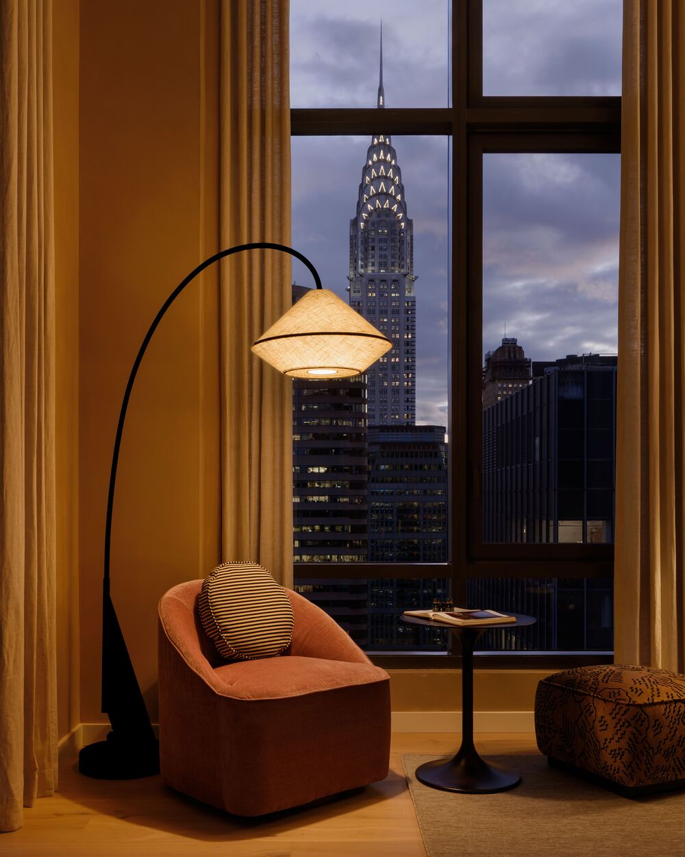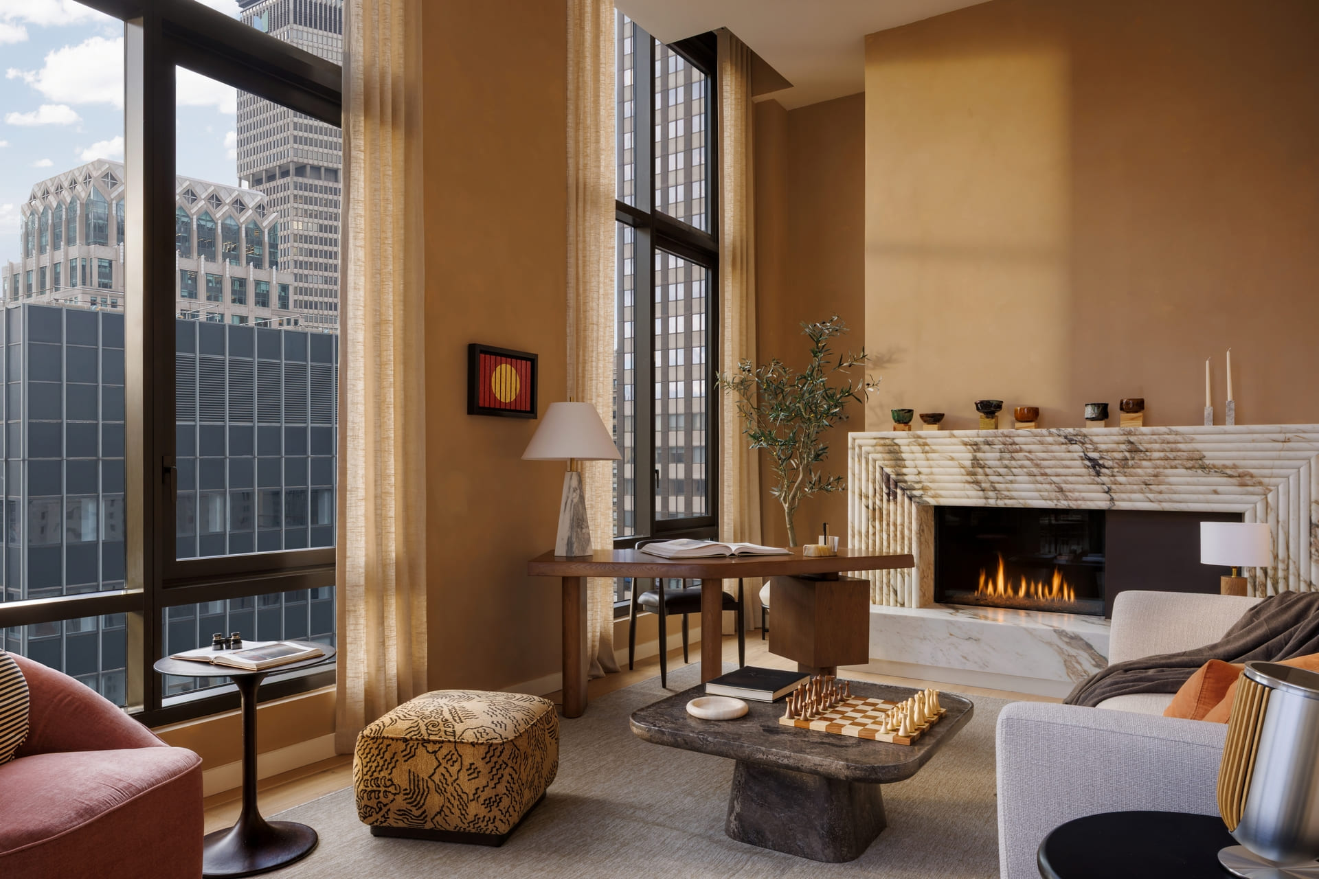 Spanning 1,674 square feet with 15-foot ceilings, the penthouse opens onto a sequence of vistas that sweep across Manhattan. From the Chrysler Building to the East River and the newly completed JPMorgan Chase Tower, each view becomes an integral part of the living experience, transforming the skyline into a constantly evolving artwork.