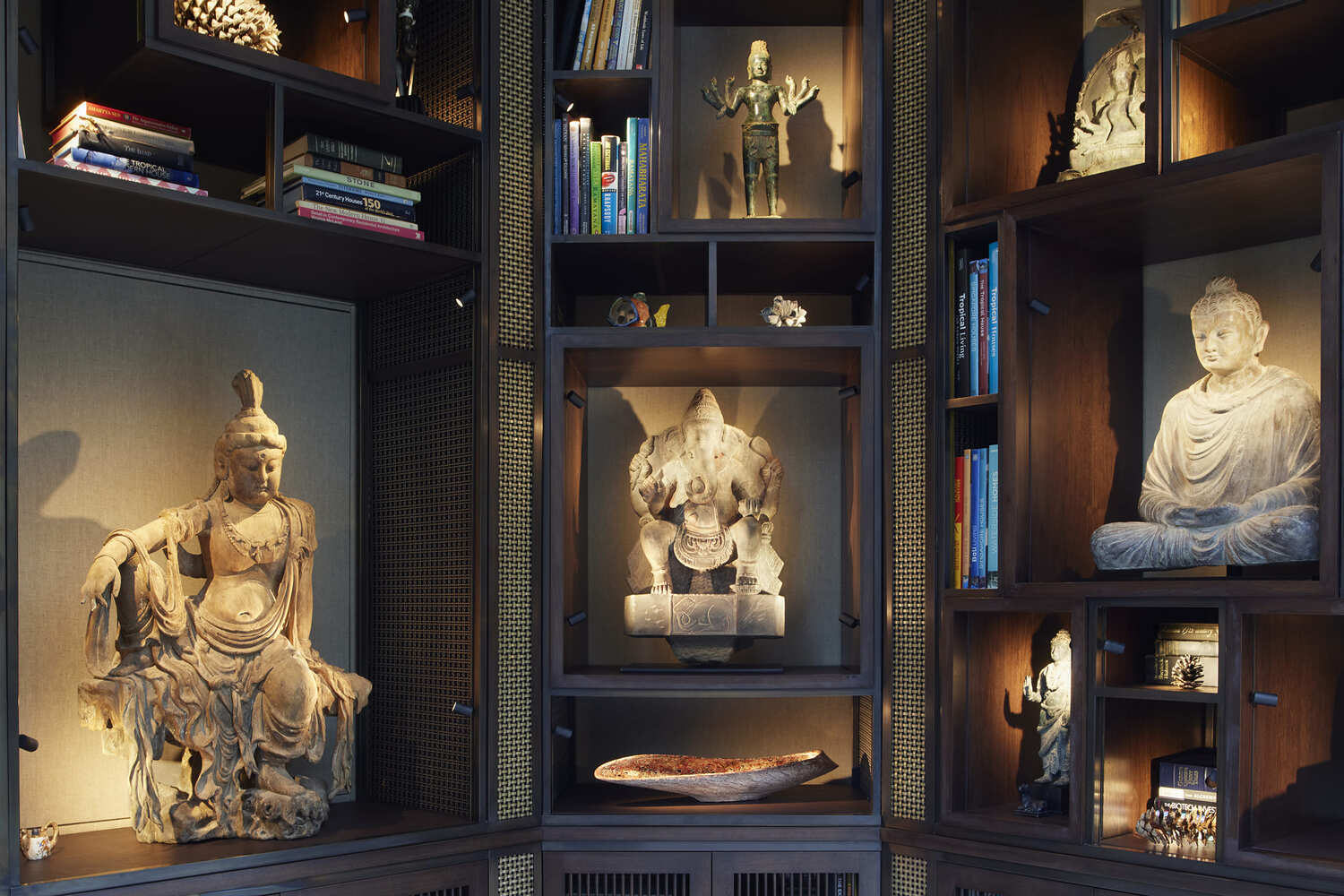 Inside, sound encounters art. Every detail – from bespoke joinery to the discreet integration of technical blinds – has been carefully considered to preserve the acoustic integrity, allowing the music and the client’s collection of artefacts to take centre stage. Material choices are deliberately restrained: a grey microcement floor, backlit metal panels showcasing prized pieces, and a suspended Wonderglass lighting installation that ripples across the floor like water as light plays upon it. Everything is orchestrated to maintain a delicate balance between contemplation and intimacy.