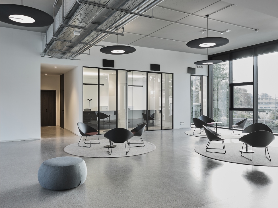Inside, the design fosters openness and connectivity through two transparent courtyards, which channel light into the building while housing lush internal gardens. These elements visually and physically link the different levels, encouraging spontaneous interaction among occupants. Circulation within D2 is not merely facilitated by staircases and lifts but also by the strategic use of luminosity and transparency. The interior concept emphasises visual openness, knowledge exchange, and nature as a regenerating element. Social interaction is at the core of the space, supported by thoughtfully designed areas for ideation, collaboration, and relaxation. The material approach is minimalist yet rich in detail, using a sensory-driven design philosophy to define communal spaces. Cool-toned flooring and warm, inviting fabrics characterise corridors, lunch areas, and meeting rooms, while each function-specific space maintains its own unique identity.