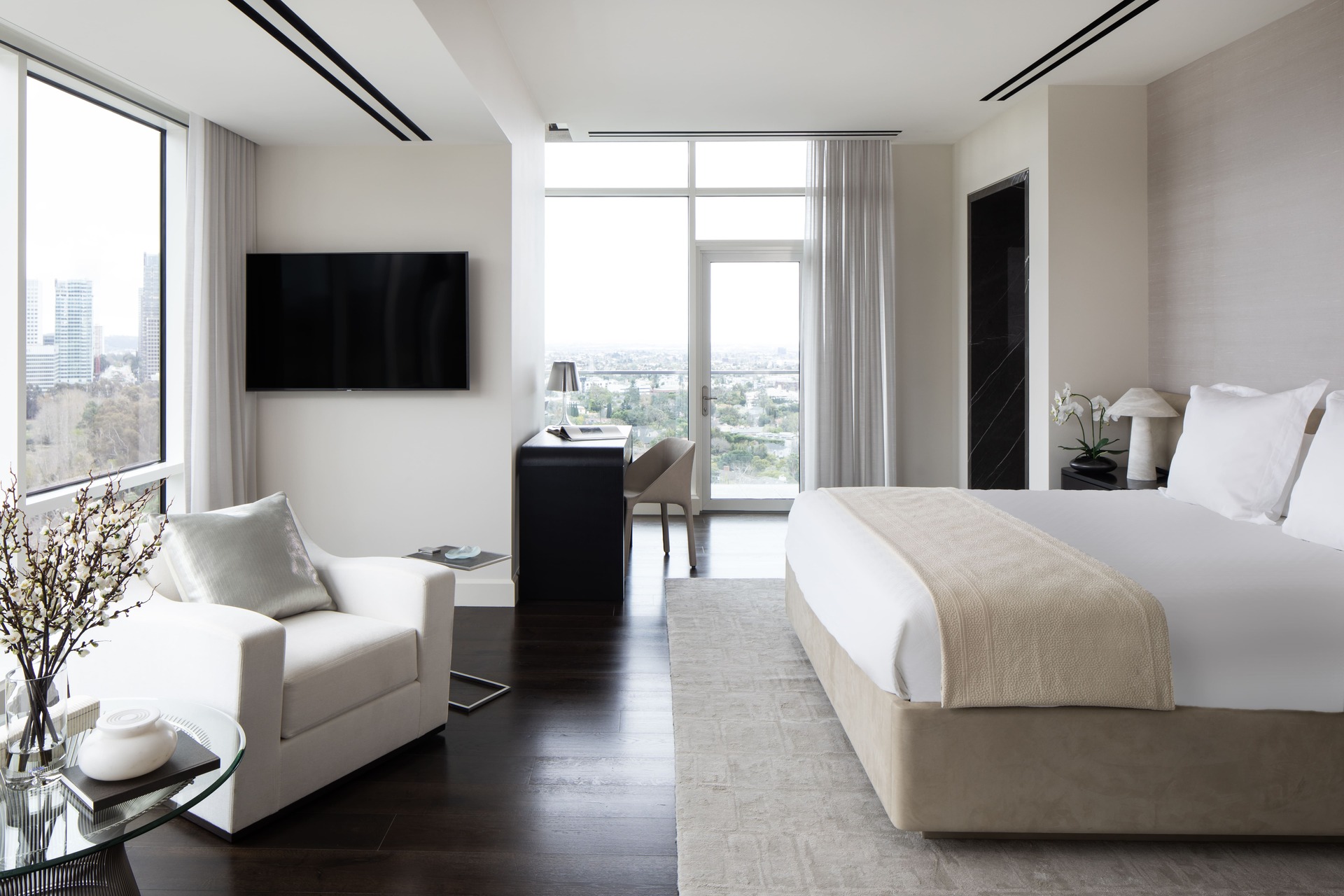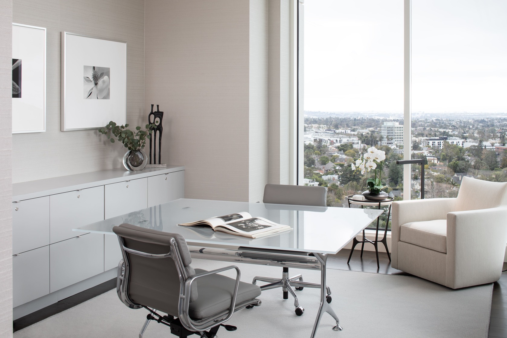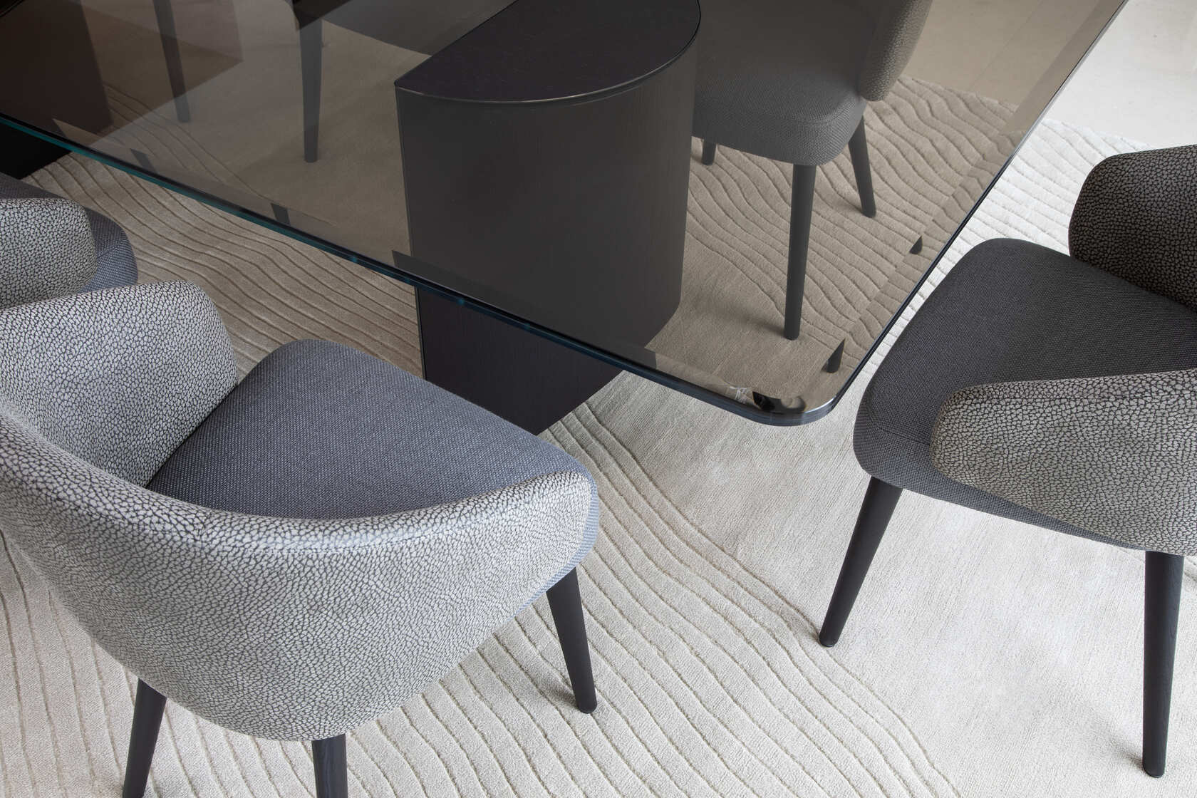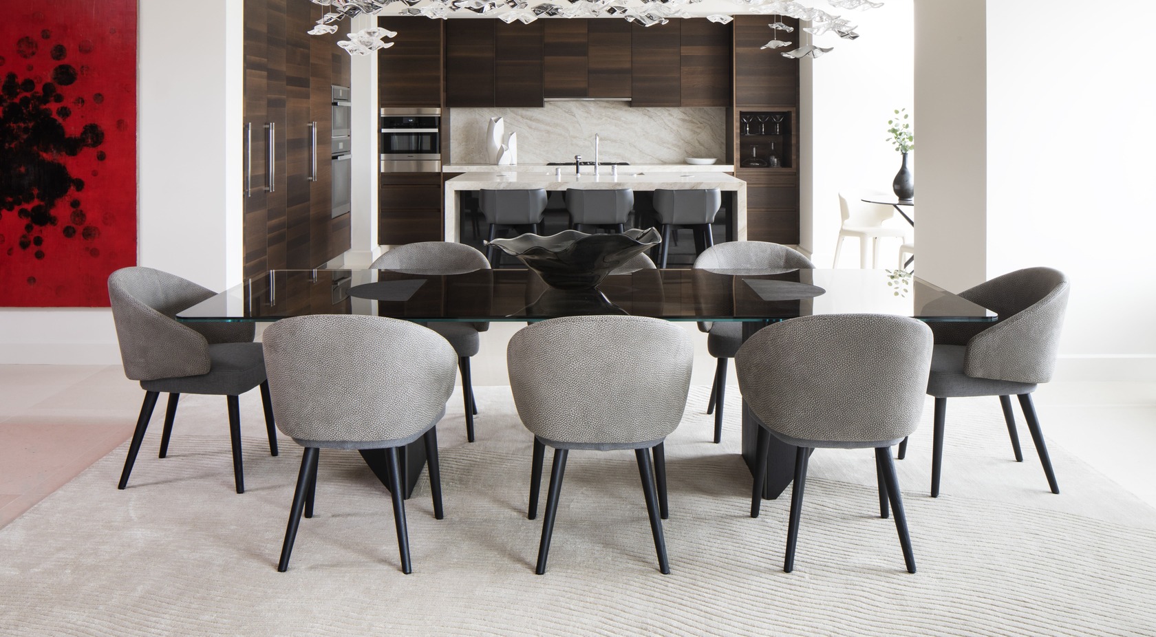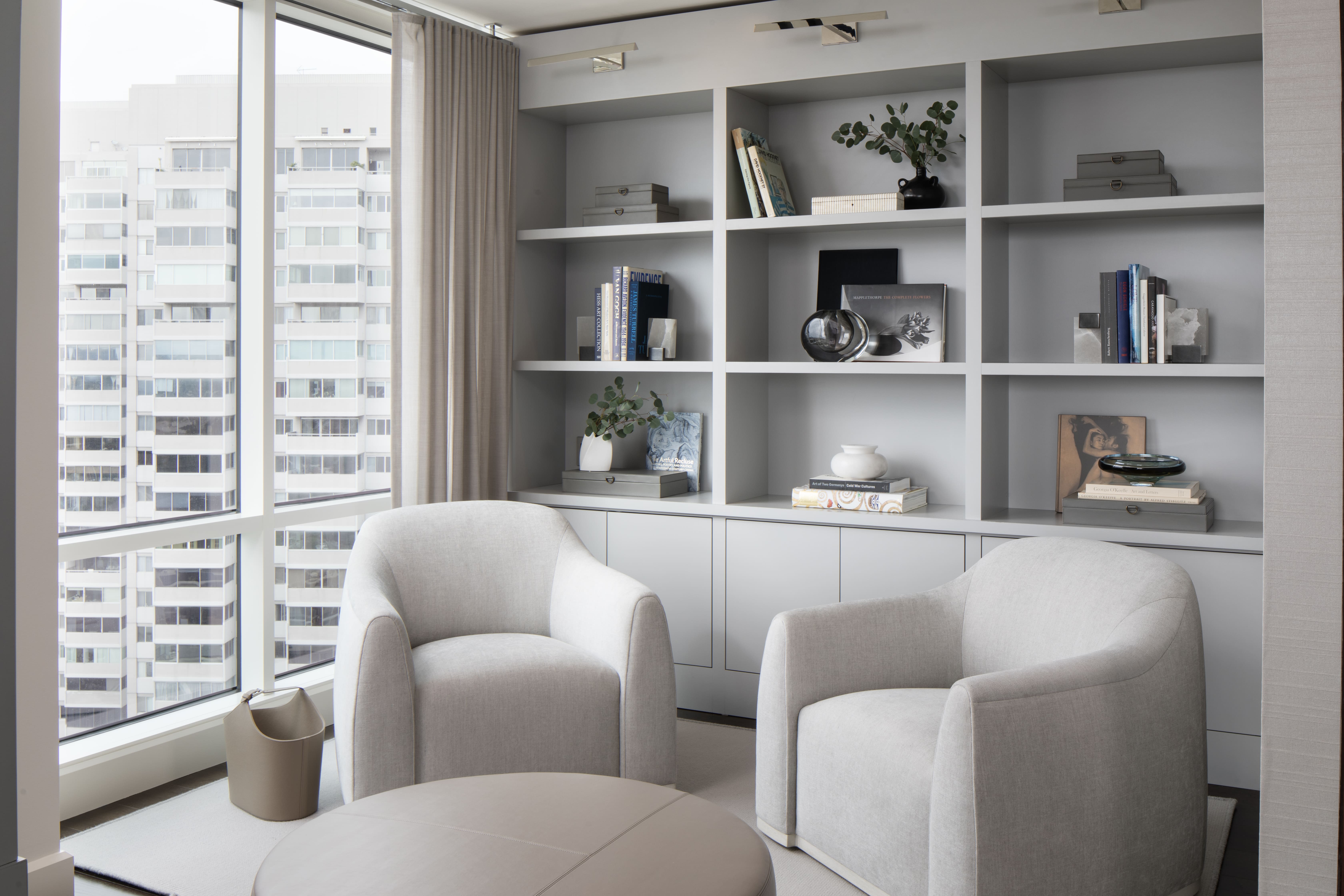 In the dining area, the statement Wedge Dining Table takes centre stage, encircled by eight Lawson chairs by Minotti, a pairing that feels both grounded and refined. This sense of thoughtful balance continues into the living area, anchored by Minotti’s Hamilton Composed Sofa – an elegant frame for relaxed gatherings. Complementary pieces from Roche Bobois, including the Kasuka stools and the Rondo Casegoods sideboard, bring in European flair, while the JB Swivel Chairs in grey mohair from Bright Chair (via Thomas Lavin) add a sculptural softness. Meanwhile, the study features the sculptural Dune Chairs by Elisa Carlucci for Quintus Home – at once minimalist and expressive.