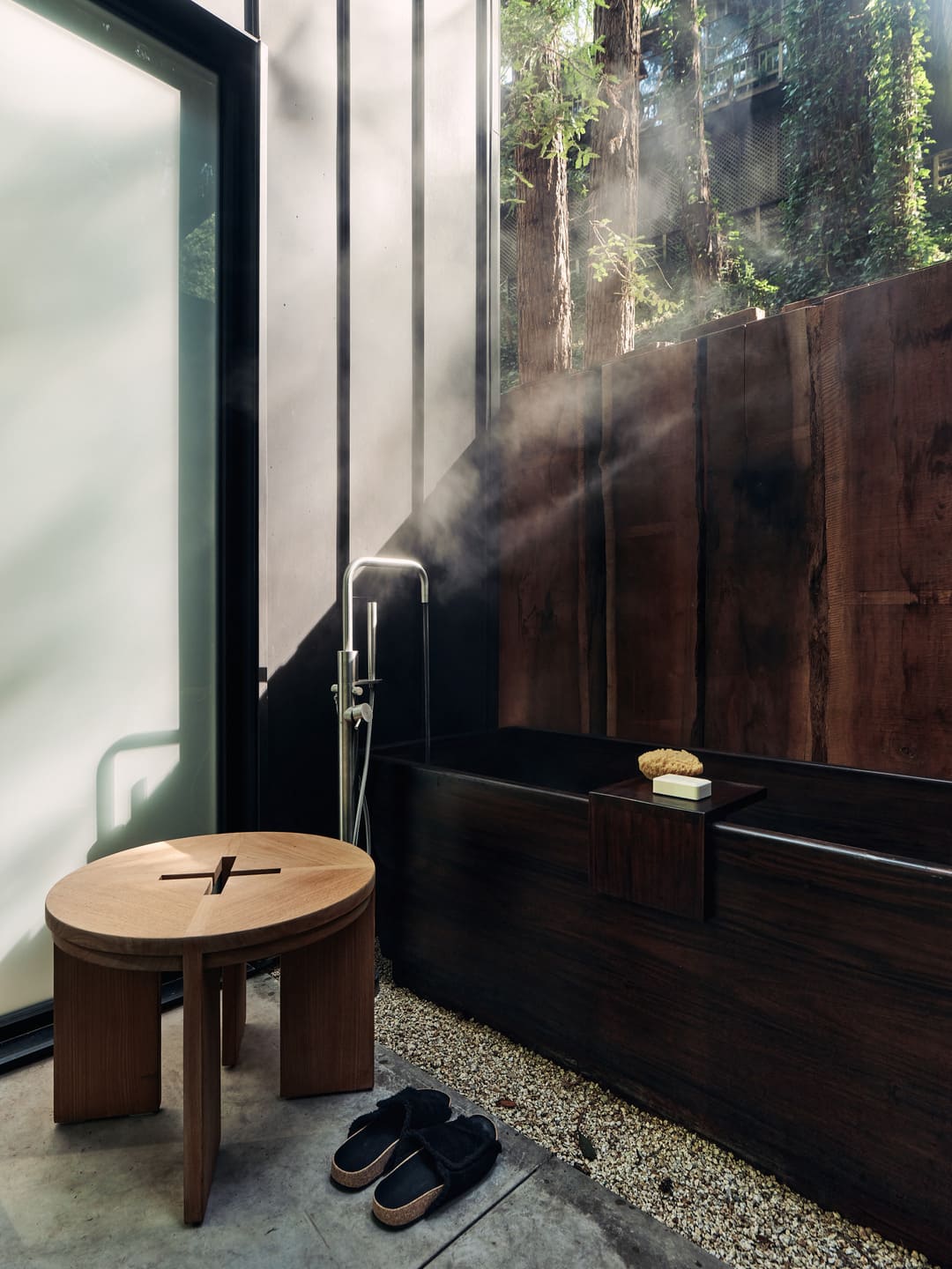 The structure is organized into three distinct volumes – the great room, a bath pavilion, and the bedroom suite – each with its own private patio. This configuration separates functions while maintaining visual and spatial connections to the forest. The choice of materials reinforces this integration: all siding, wall paneling, and cabinetry are crafted from locally sourced reclaimed redwood, giving the home warmth and texture while echoing the region’s natural heritage.