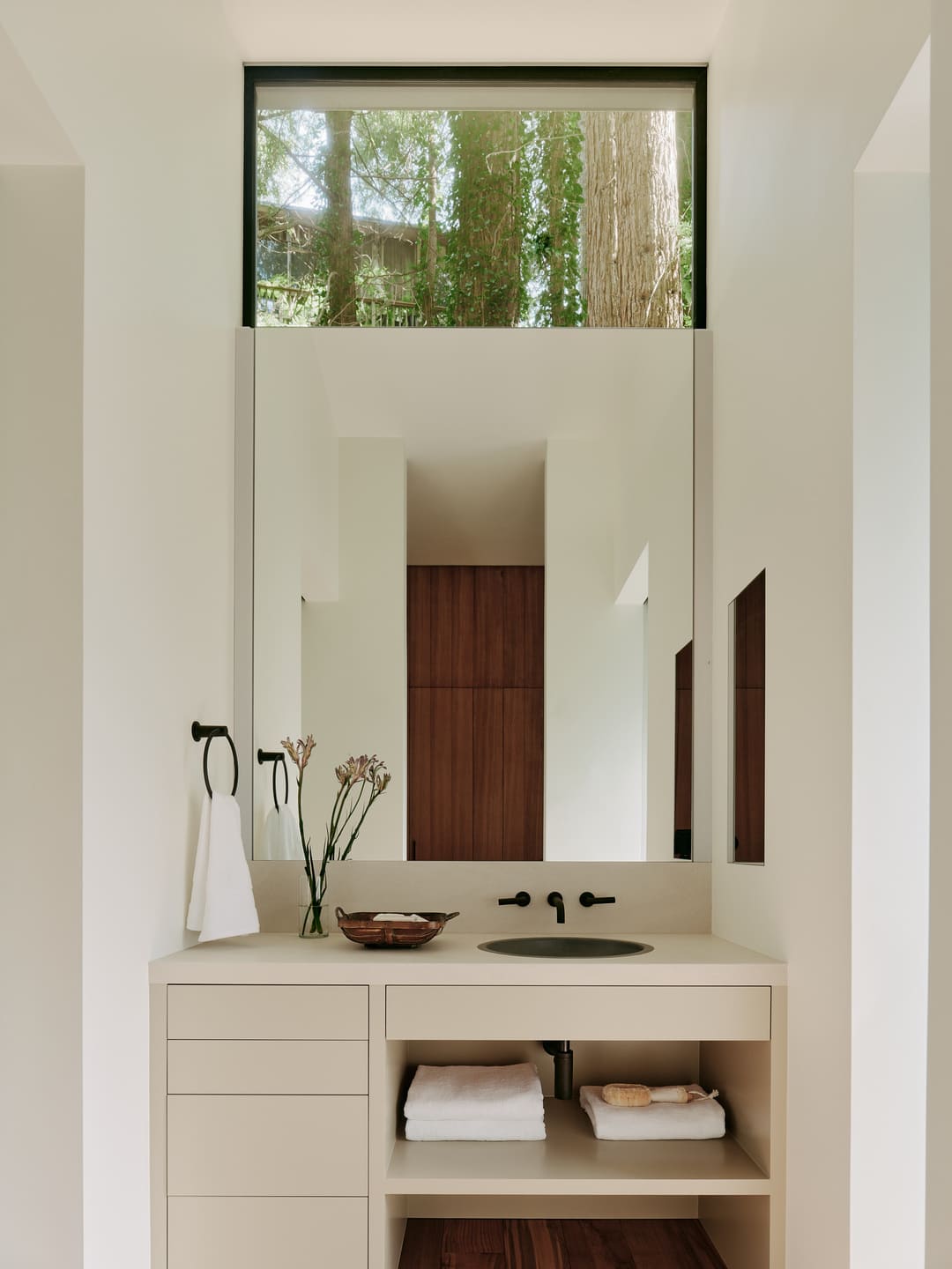 Sustainability informed both materials and systems. The great room features a green roof with an edible garden, while the other volumes are capped with aluminum roofs designed for durability and low maintenance. A modern septic system protects the nearby creek from contamination, and underground power lines reduce risk from falling trees. Every element, from site planning to infrastructure, was considered to minimize environmental impact without compromising the home’s functionality or comfort.