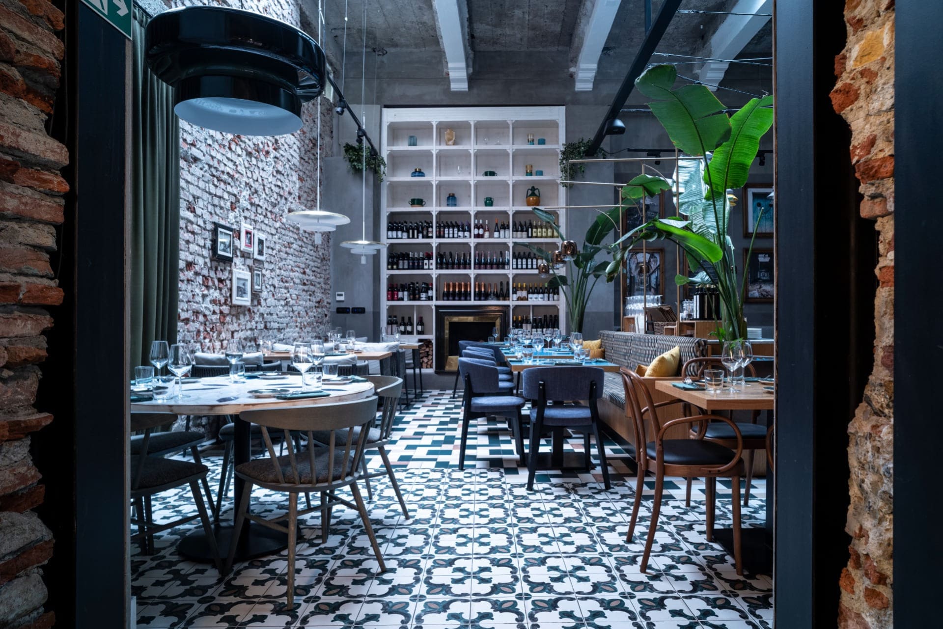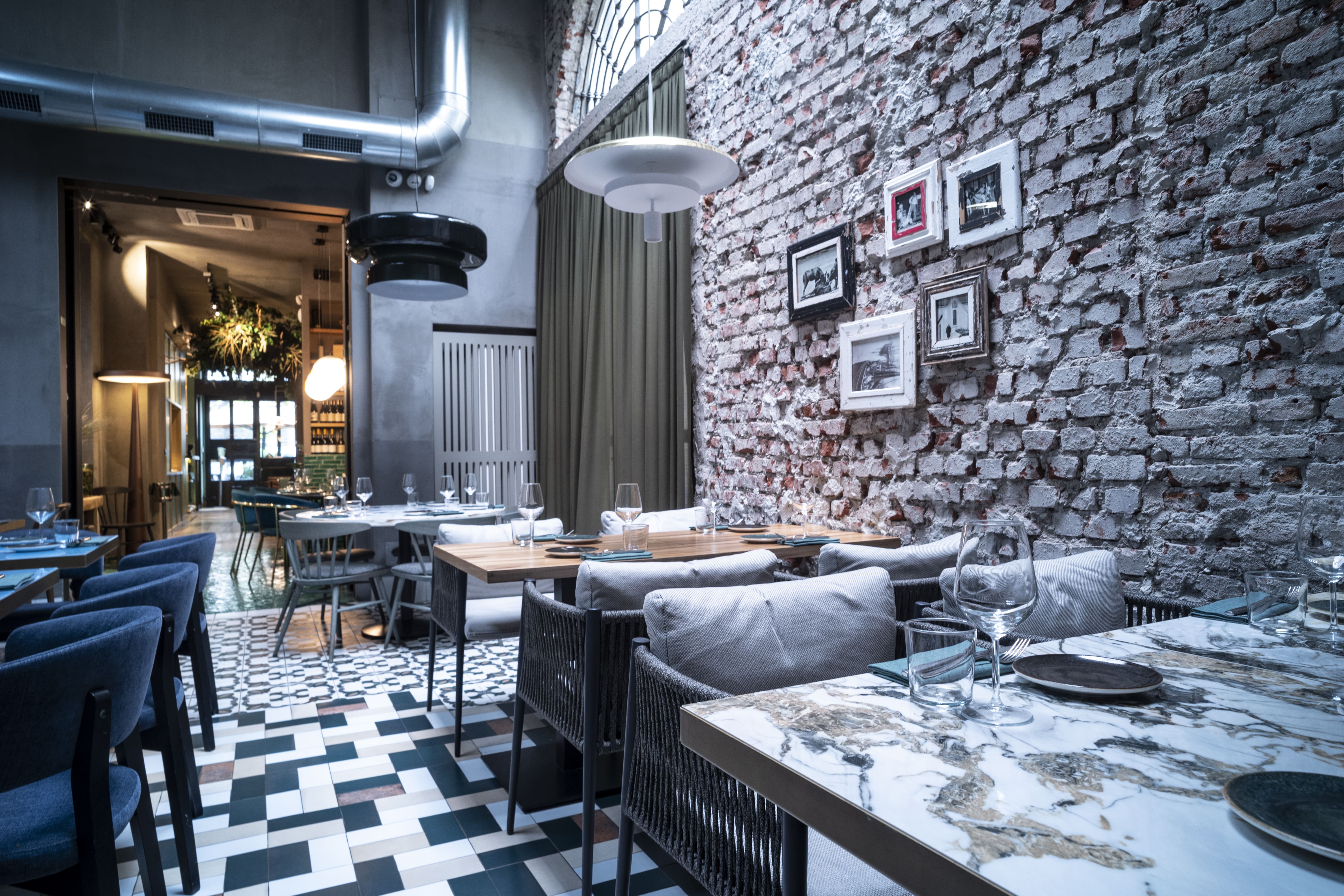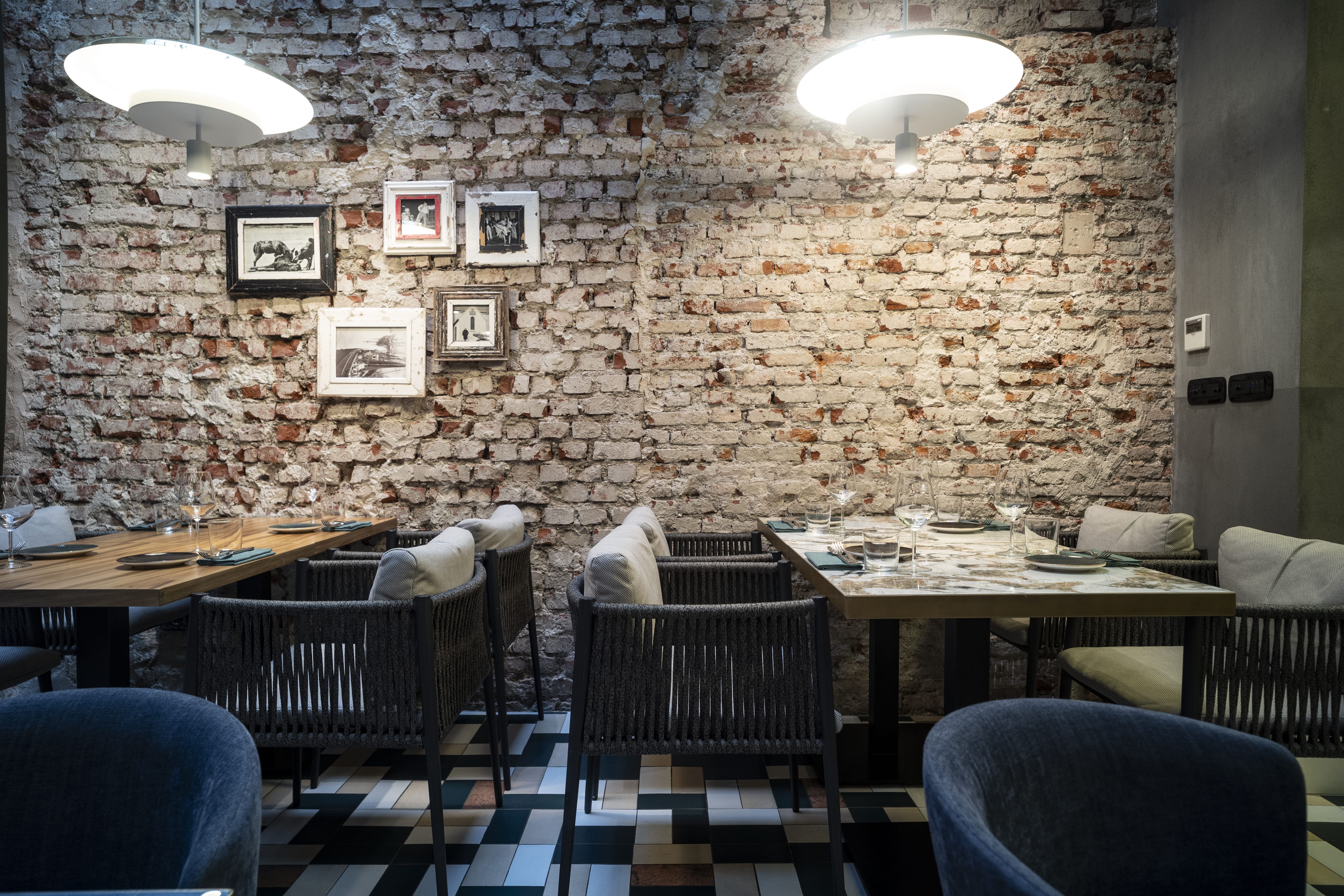 Proceeding past the kitchen, one finds himself in the hall, which is defined by high ceilings, red brick walls and an exposed attic. These so to speak “rough” features stand in harmonious contrast with the furniture. This latter, indeed, presents a warm and familiar design, as exemplified by the large wooden library used as a wine cellar and the fireplace in brass finish. The tables constitute an additional element of dialogue with the customers. Designed in different materials, we find them in marble, handmade majolica, back lacquered glass or wood, all never covered by tablecloths. Regarding the chairs, Elitis coloured fabrics in harmony with the colour palette of the building materials were chosen for the sofas. This attitude, which Giovanni Musica defines as “democratic”, allows the client to choose where to sit according to his needs.