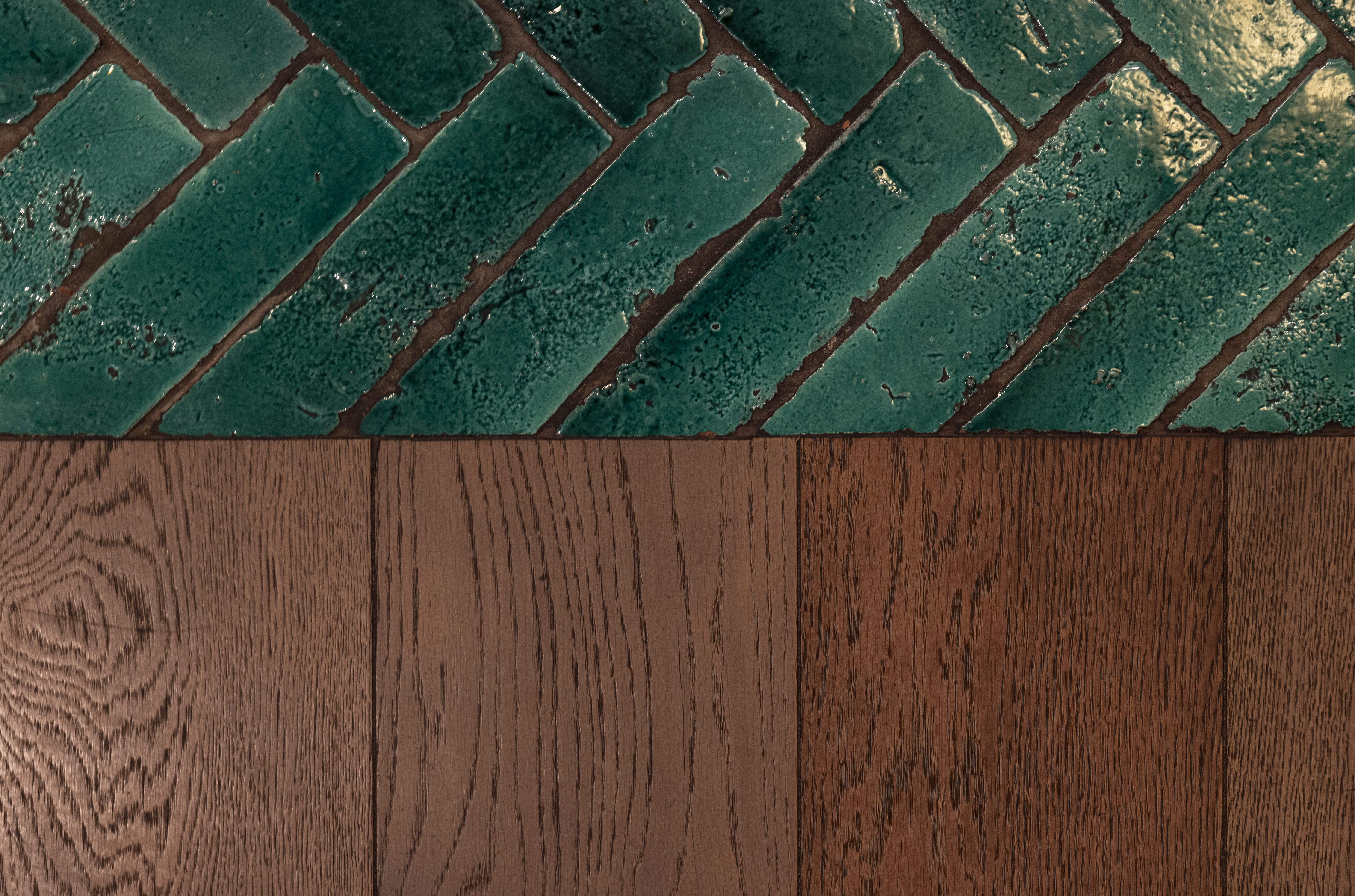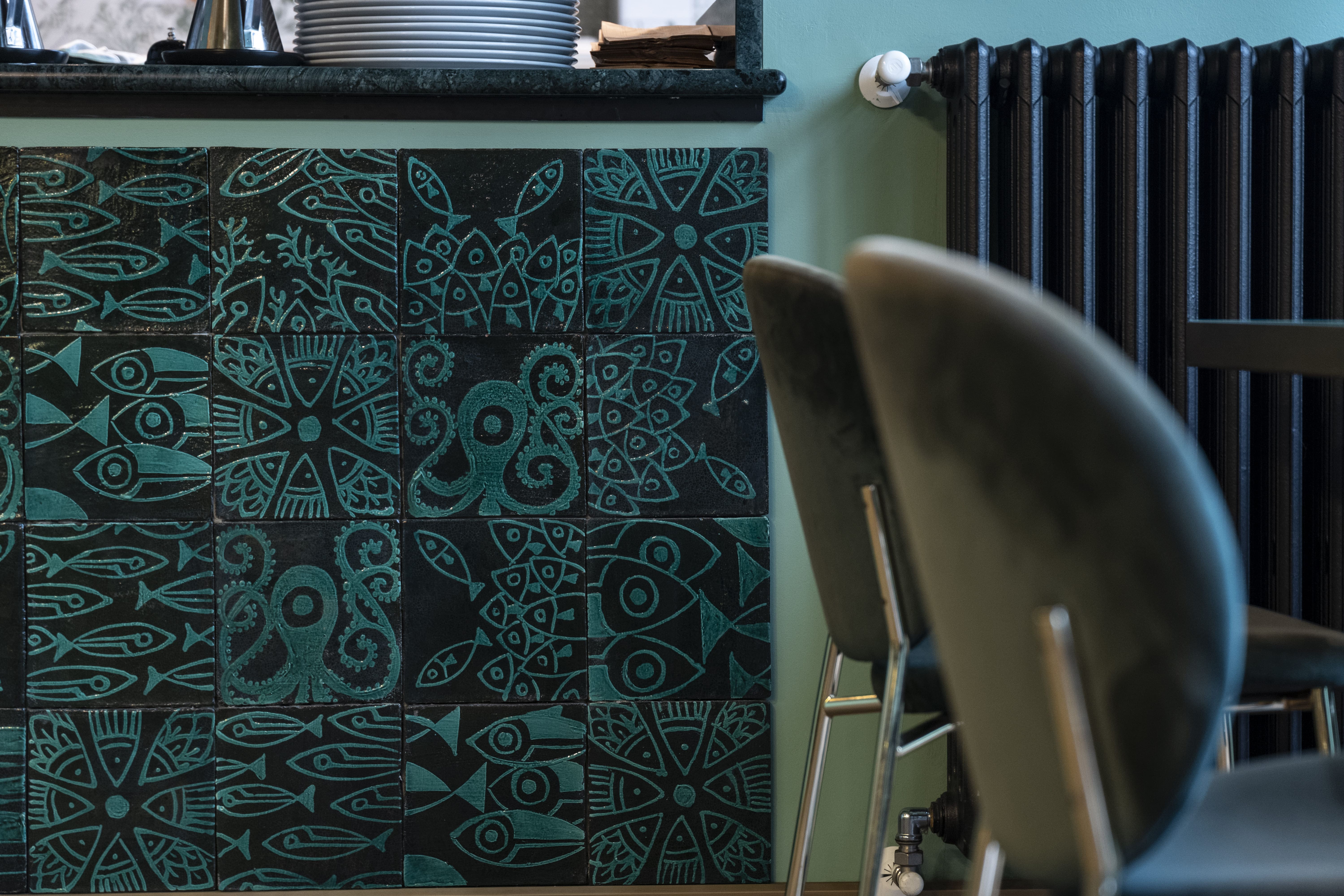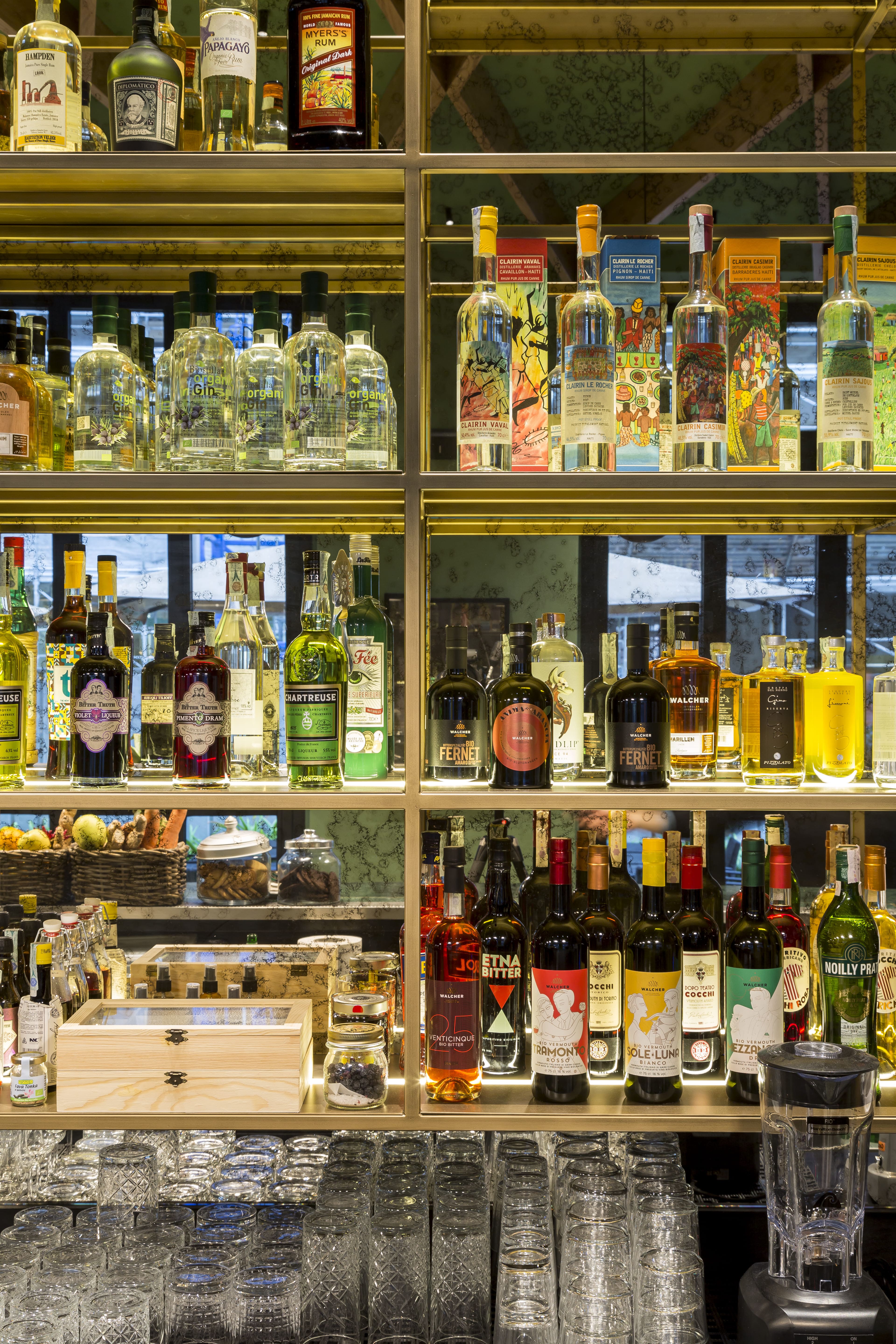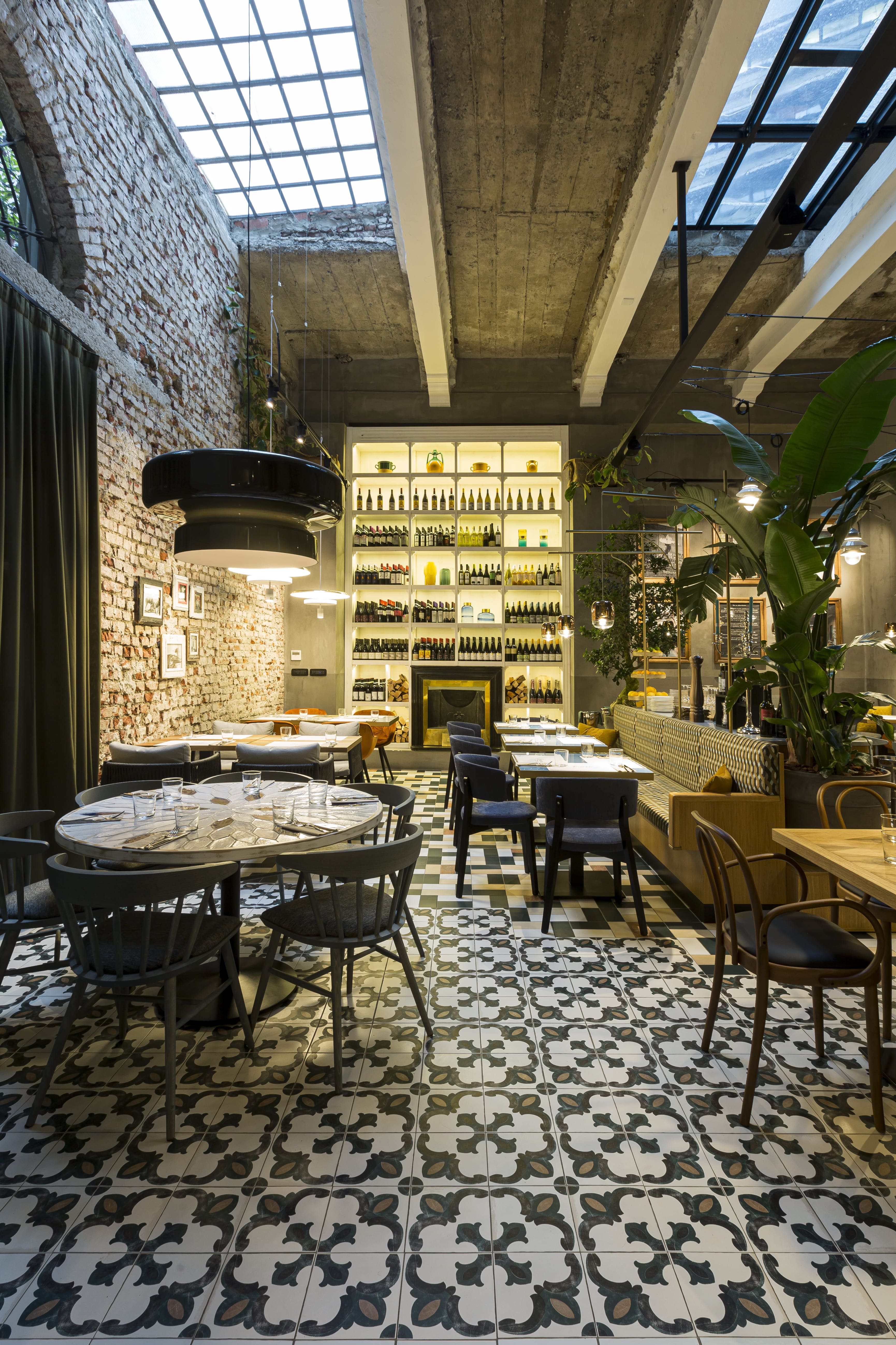 Proceeding past the kitchen, one finds himself in the hall, which is defined by high ceilings, red brick walls and an exposed attic. These so to speak “rough” features stand in harmonious contrast with the furniture. This latter, indeed, presents a warm and familiar design, as exemplified by the large wooden library used as a wine cellar and the fireplace in brass finish. The tables constitute an additional element of dialogue with the customers. Designed in different materials, we find them in marble, handmade majolica, back lacquered glass or wood, all never covered by tablecloths. Regarding the chairs, Elitis coloured fabrics in harmony with the colour palette of the building materials were chosen for the sofas. This attitude, which Giovanni Musica defines as “democratic”, allows the client to choose where to sit according to his needs.