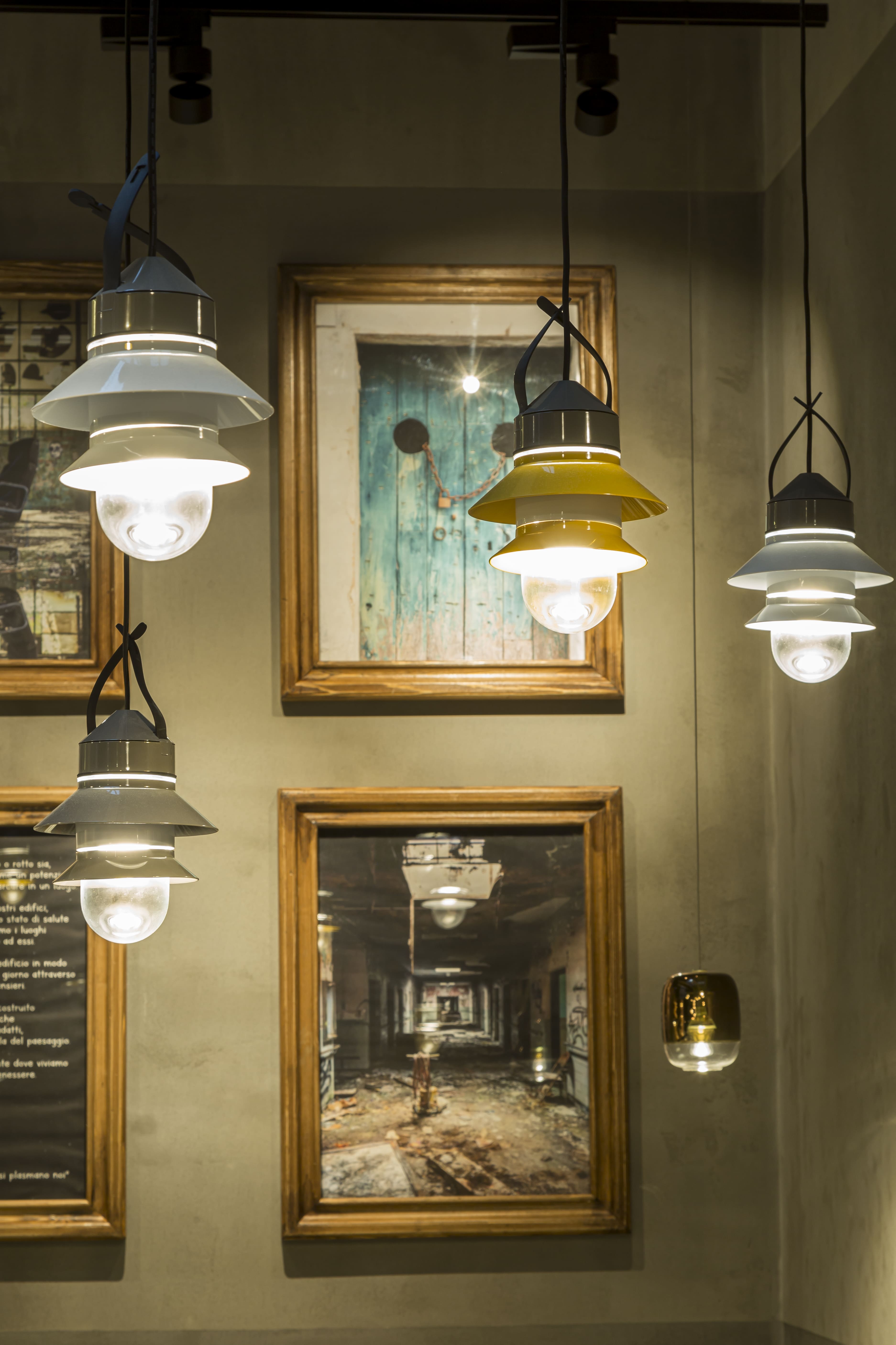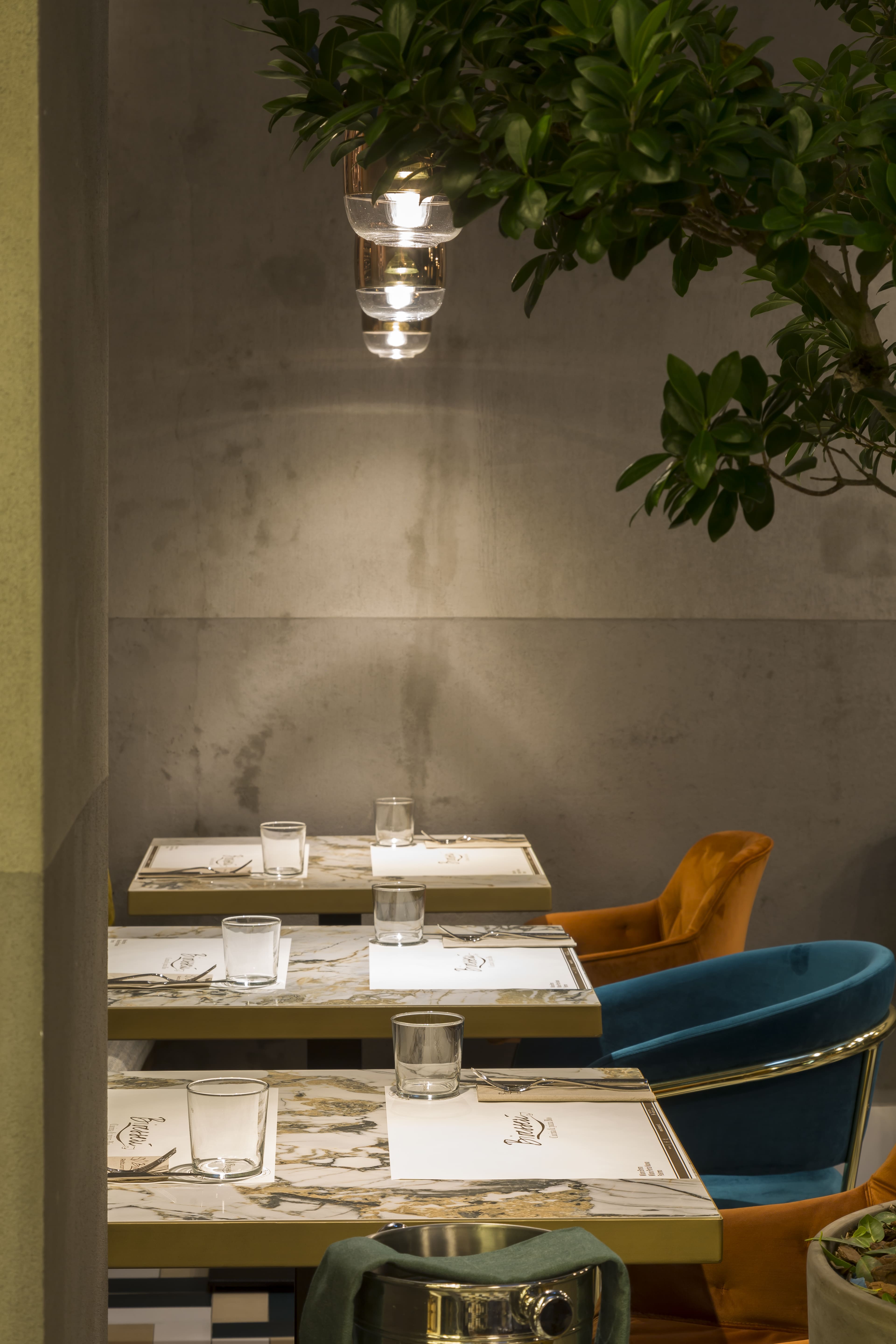 Equally important was the choice of technical and decorative lights, all coming from Marset Lighting. Given the height of the ceilings, the main need was to properly illuminate the tables. In order to ensure a certain flexibility in the movement of the tables, the interiors were provided with an essential technical lighting that enhanced the property and a design lighting attentive to the customer and the tables. Therefore, on the left side, where the tables are immovable, MGAlab wanted to punctually illuminate the tables by inserting different types of lamps of different materials and colours, so as to define a scenography, while in the right side the lamps were inserted on steel cables so that they could slide according to the arrangement of the tables.