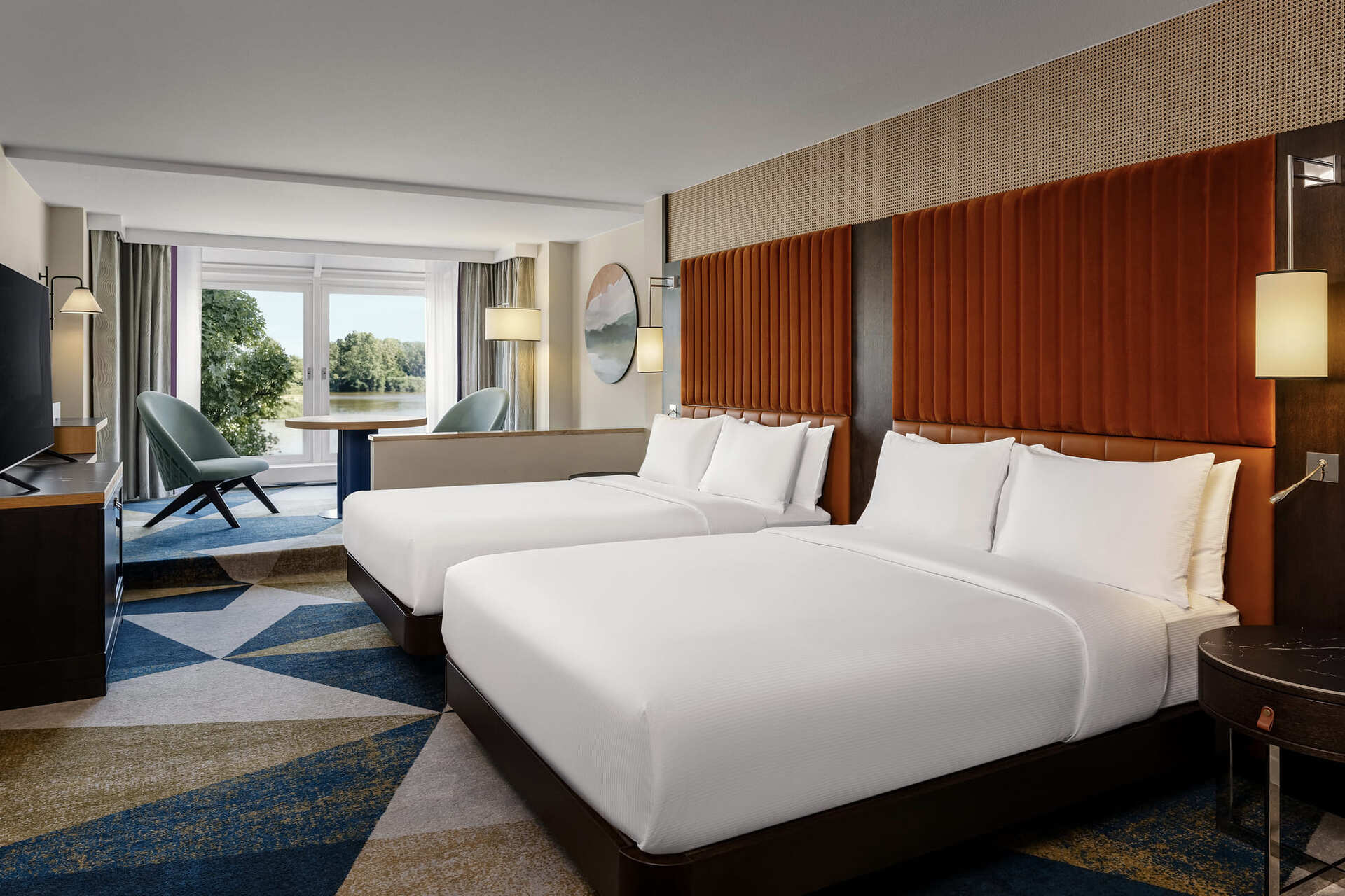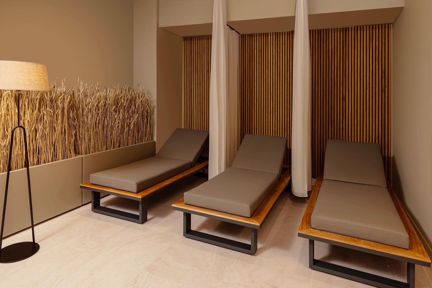Beyond its interiors, Hilton Vienna Waterfront makes full use of its location. The outdoor pool sits within a green terrace, the Danube’s broad channel stretching beyond; in summer, it becomes less a hotel amenity than part of a larger riverside lifestyle. Guests can walk or cycle the paths of Danube Island, explore Leopoldstadt’s Prater park or markets, or retreat to the spa, where three saunas – one panoramic – frame the water as an essential part of the wellness experience. Even the palette here, creamy woods and soft neutrals, is drawn from the nearby Donau-Auen National Park, extending the outdoors inward.