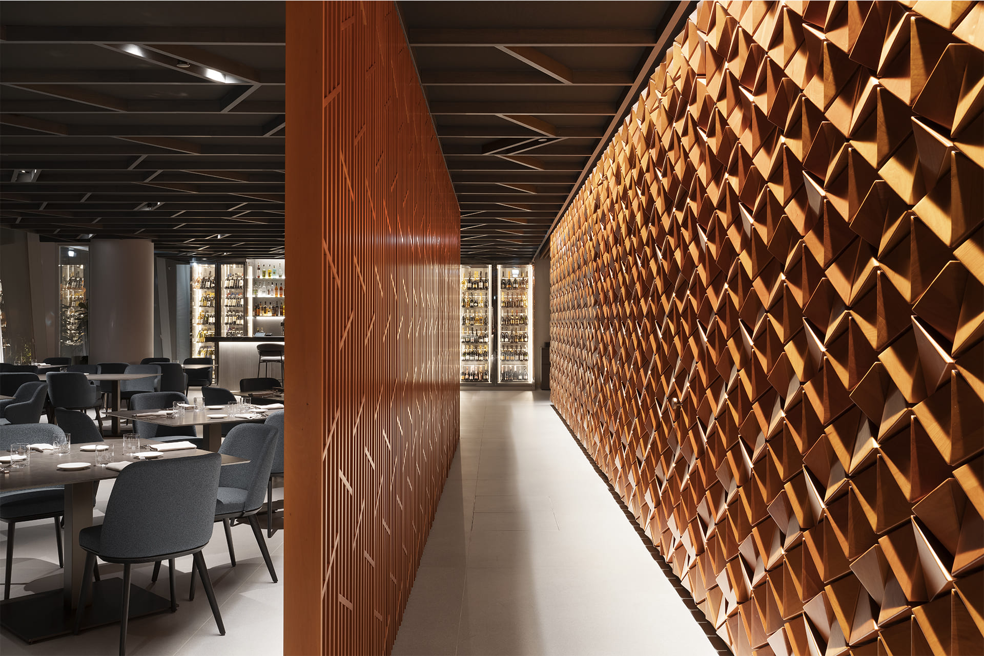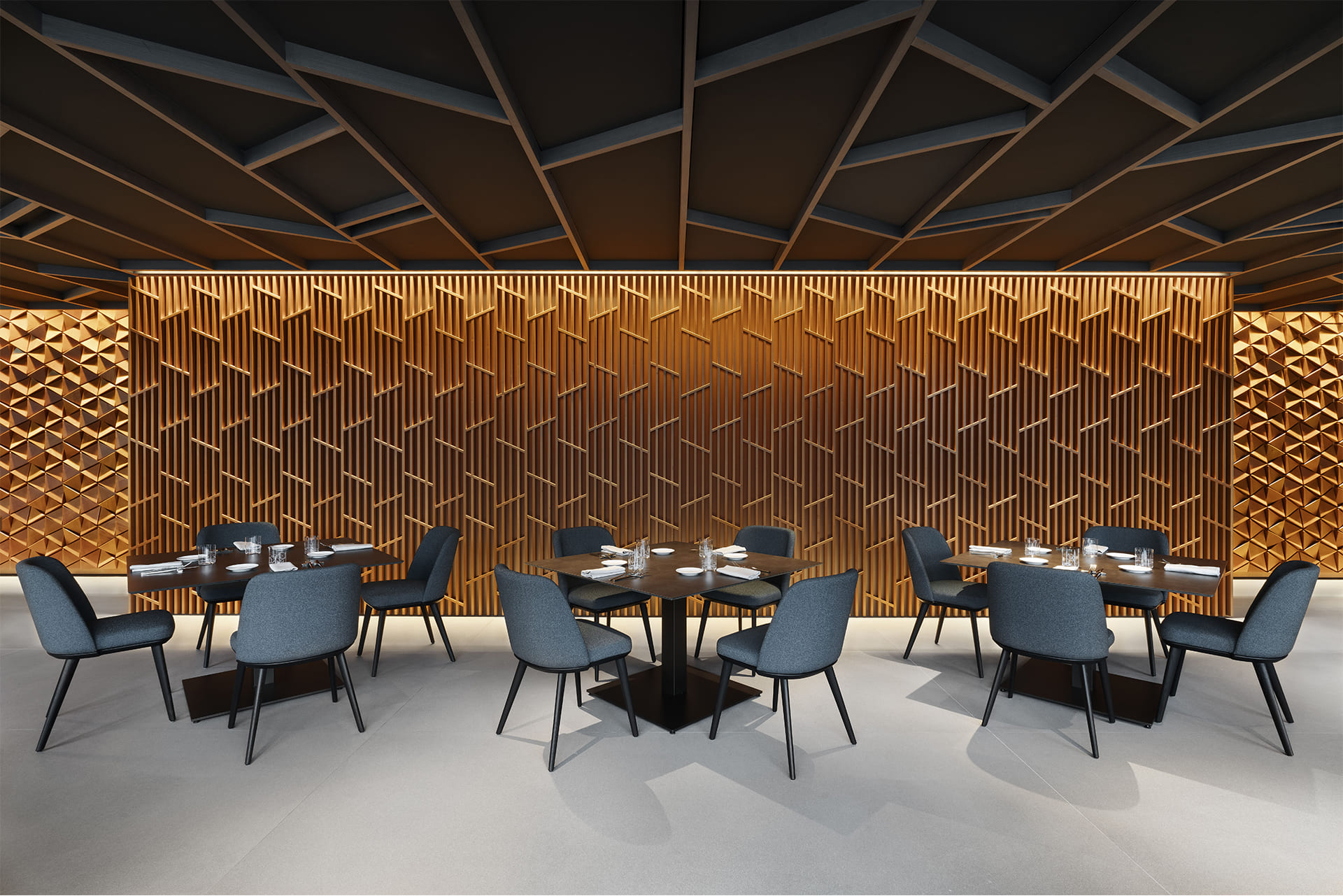 Particular attention was also paid to the lighting-technical aspects of the rooms. The sliding lights from above were designed to give, through shadows and reflections, greater relief to the geometrical theme, whose longitudinal development continues up to the kitchens. The choice of not providing the room with a uniform light, but rather to concentrate it on the walls and tables, was intentional. The outcome is a soft and metropolitan atmosphere, where the focus is on the tables. On the ceiling, a series of inclined transverse slats defines the shape of the sound-absorbing panels, doubled in correspondence to the table lighting spotlights. Acoustic comfort is indeed another of Andrea Maffei Architects’ prerogatives.