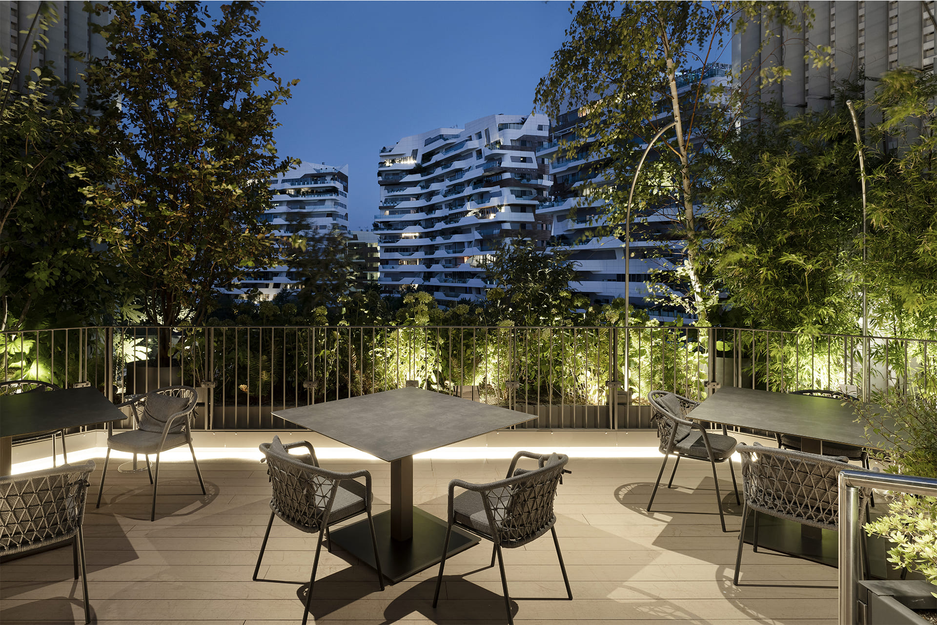 Coming to the last highlight, the large outdoor space corresponding to the terrace offers a second significant backdrop to the restaurant through the windows of Torre Allianz. There is an additional cocktail bar and a hors d’oeuvres counter in the centre, featuring the same Thala stone finishes as the restaurant. Around the counter we find tables and chairs distributed according to the shape of the green pools that make up the landscape of the terrace.