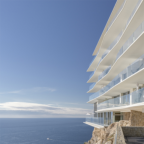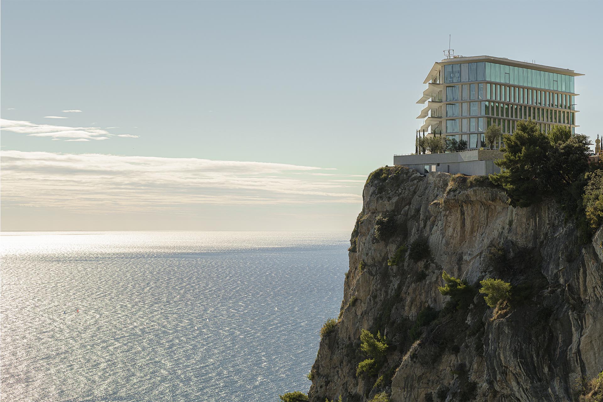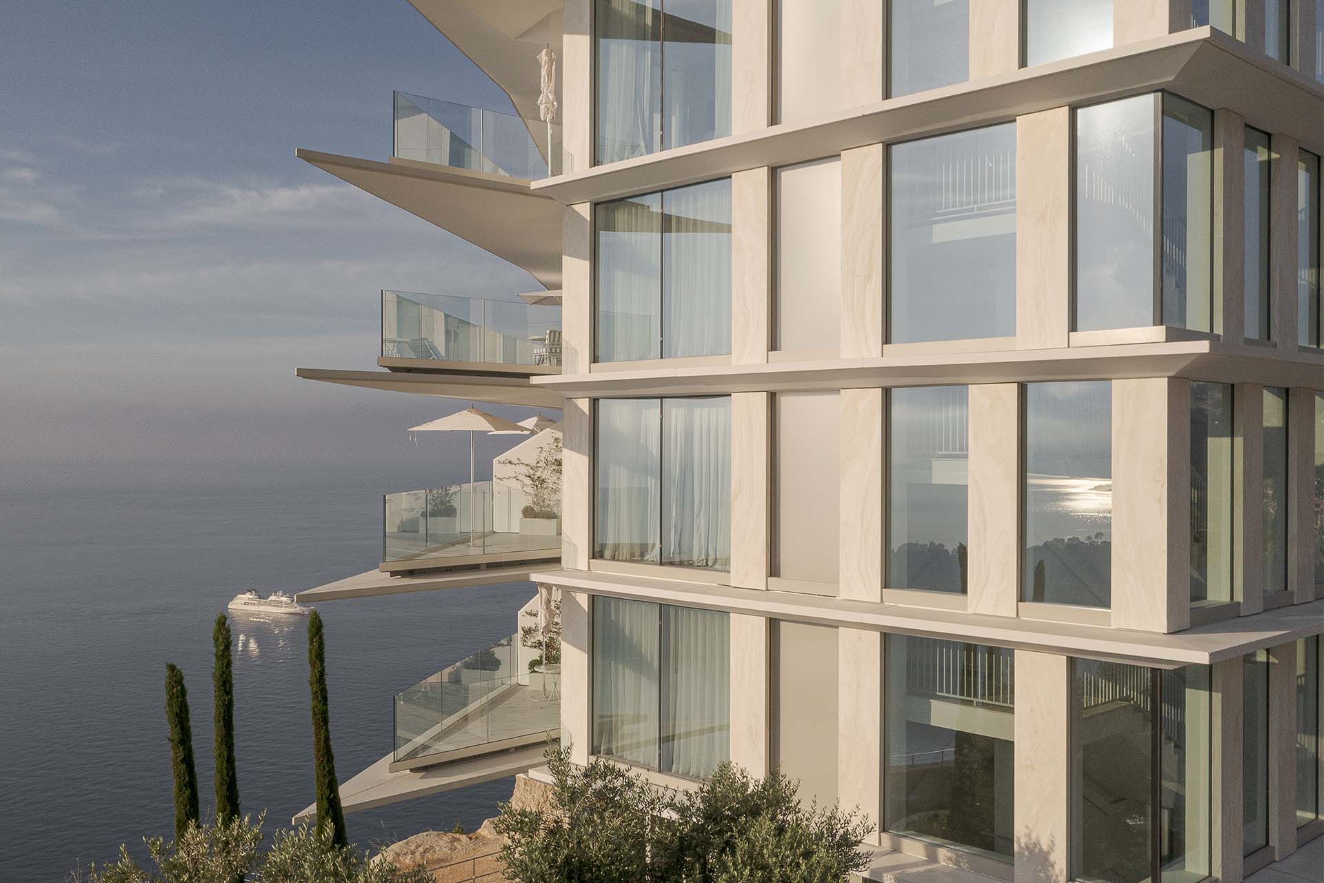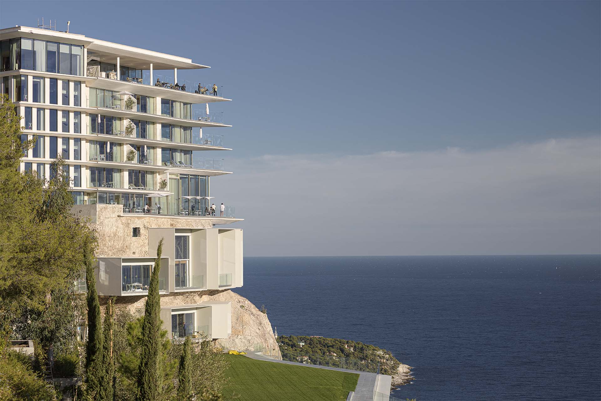 The starting point of this project cantilevered between the cliffs of the glittering Côte d'Azur was an already existing hotel, which the Wilmotte & Associés studio was commissioned to modernize and rehabilitate. To this end, the site and layout of the buildings have been completely redesigned. Not an easy task, given the steep terrain. As pointed out by the team of the studio, the main challenge was to rebuild the volume of the hill with an intervention as little invasive as possible. Of the original structure has been maintained only the “triangle” building, whose position on top of the rocky spur allows to reduce the volume of the complex and to access a remarkable view from the rooms.