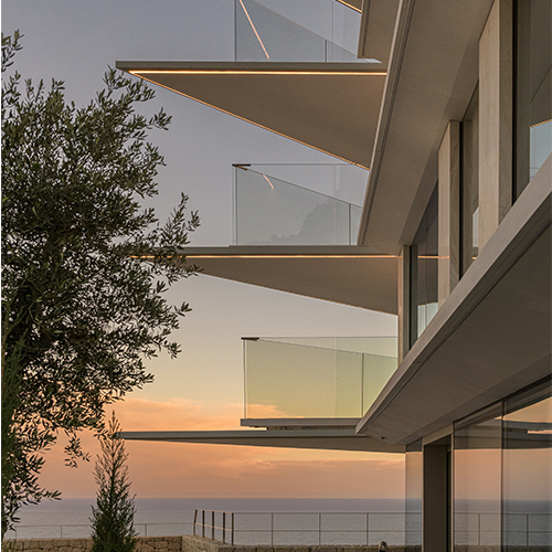 The unity between the two sections of the building, the upper and the lower, is given by the emphasis placed on horizontal lines. The ends of the slabs on the floors of the main building were refined and placed in greater evidence by the glass railings on the long balconies. This model is echoed by the folds of the panoramic terraces that, as contour lines, accentuate the horizontal nature of the building and its being in harmony with the surrounding landscape. The link with the latter is further strengthened by the use of white cement, creating an illusion of continuity. The impression of vertigo and the dramatic spectacularity of the site are emphasized by the accentuation of the overhang of the main building, suspended in balance on the cliff.