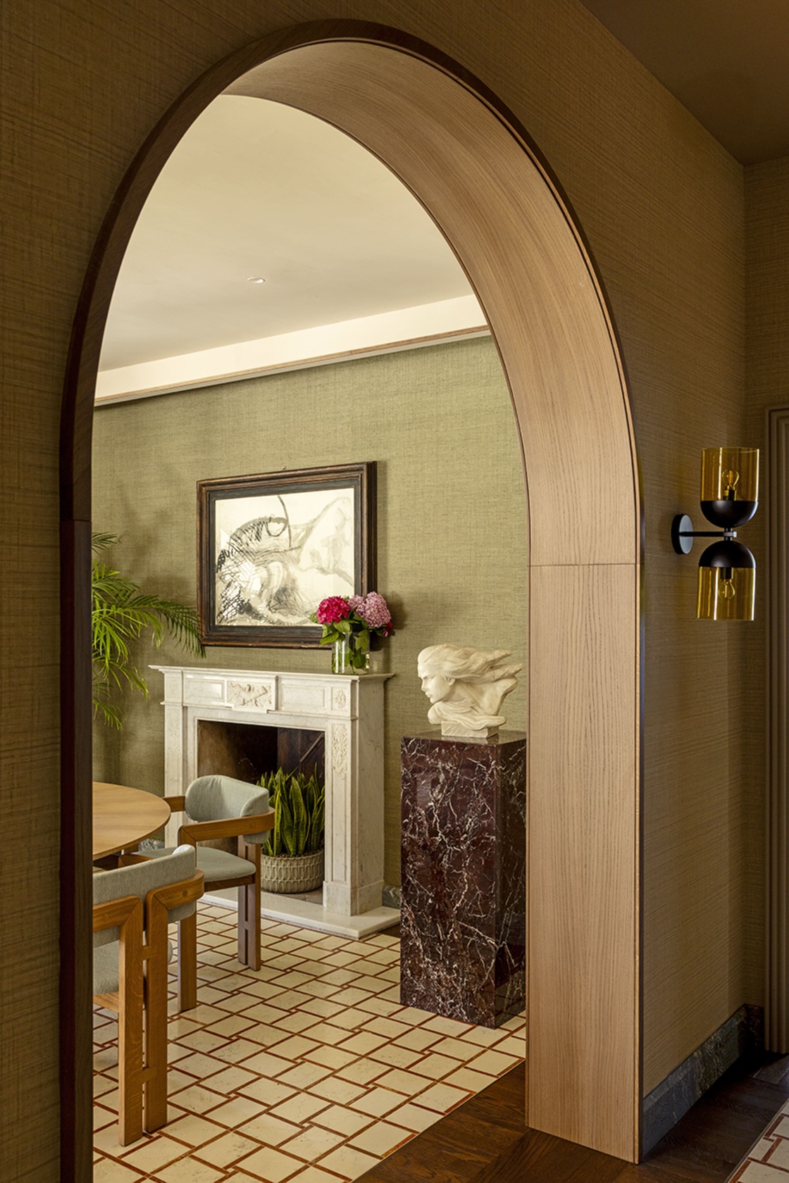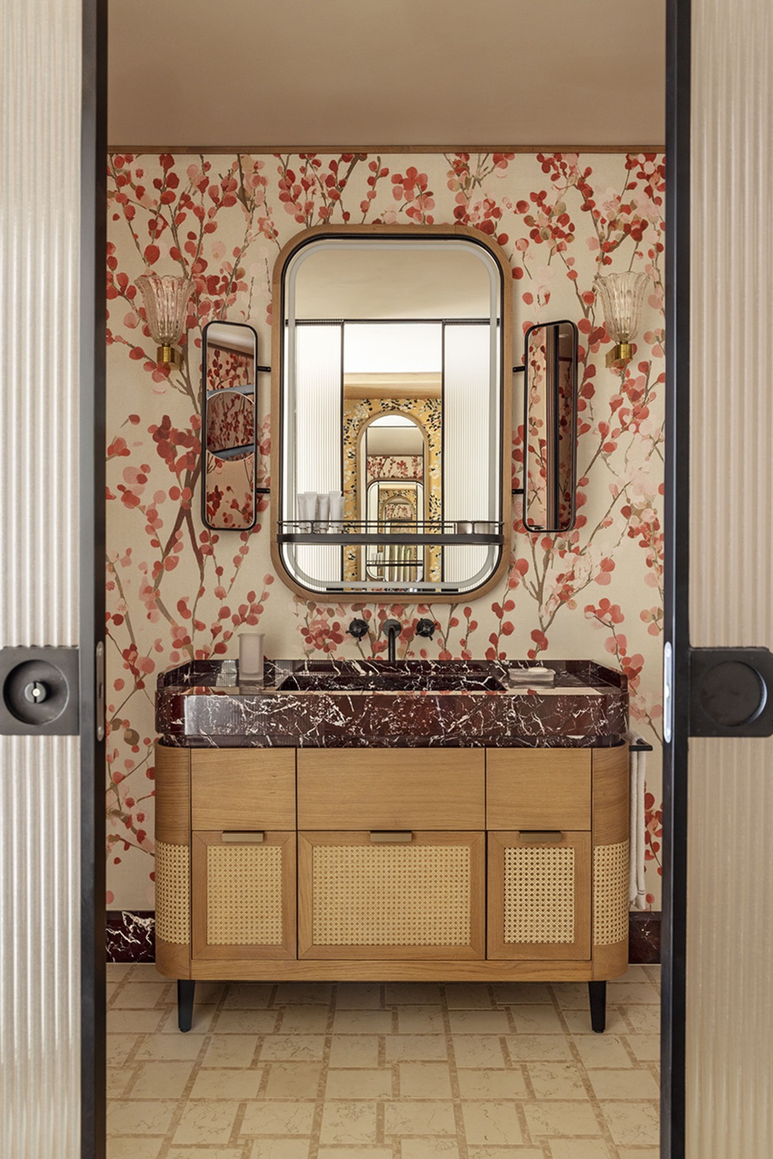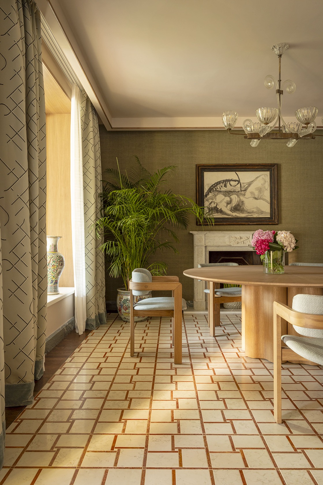 In the luminous living area, a grand custom table anchors the space beneath a vintage Barovier & Toso chandelier from the 1930s–40s, an emblem of Venetian craftsmanship. Just steps away, the iconic Quadrifoglio floor lamp, designed by Gae Aulenti for Guzzini in the 1970s, brings a sculptural modernist contrast that integrates effortlessly with the space’s warm materiality. Even transitional areas – often overlooked in residential design – become showcases of intention: the stairwell, for instance, is graced by a Vico Magistretti table for Cattelan (1980), its travertine base and crystal top evoking a play of solidity and lightness that feels emblematic of the project’s ethos. The suites continue this interplay of heritage and innovation. Each is conceived as a unique environment where the palette – drawn from nature’s own lexicon of leafy greens, sea blues, and sun-faded neutrals – enhances the architectural volumes without overwhelming them.