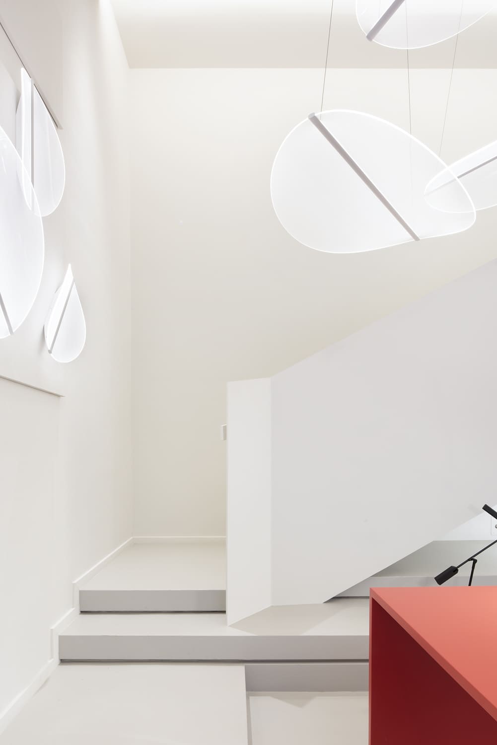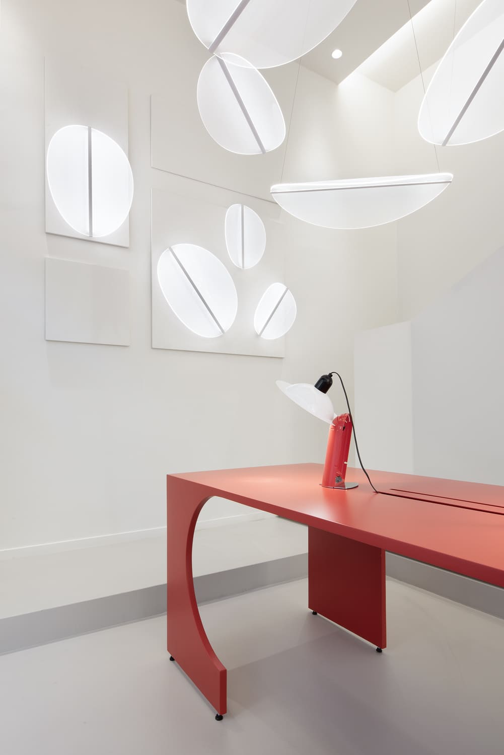 A focal point within the ground-floor layout is a long red metal table, also designed by Tortato. Its geometric form and bold chromatic contrast introduce a moment of tension within the otherwise neutral environment. More than a piece of furniture, it functions as a social and operational surface – a place for exchange between designers, clients, and the company’s creative teams.