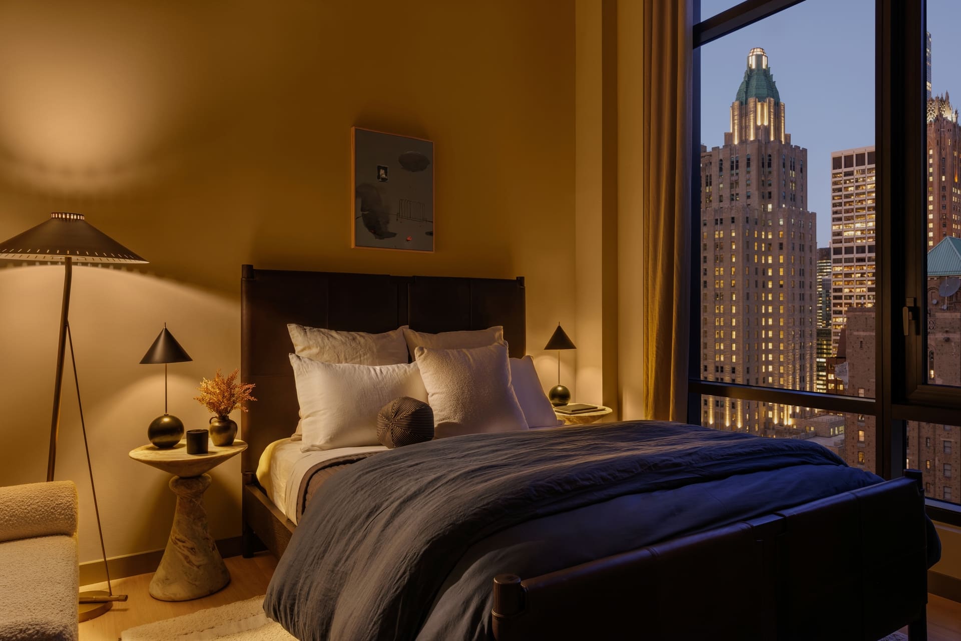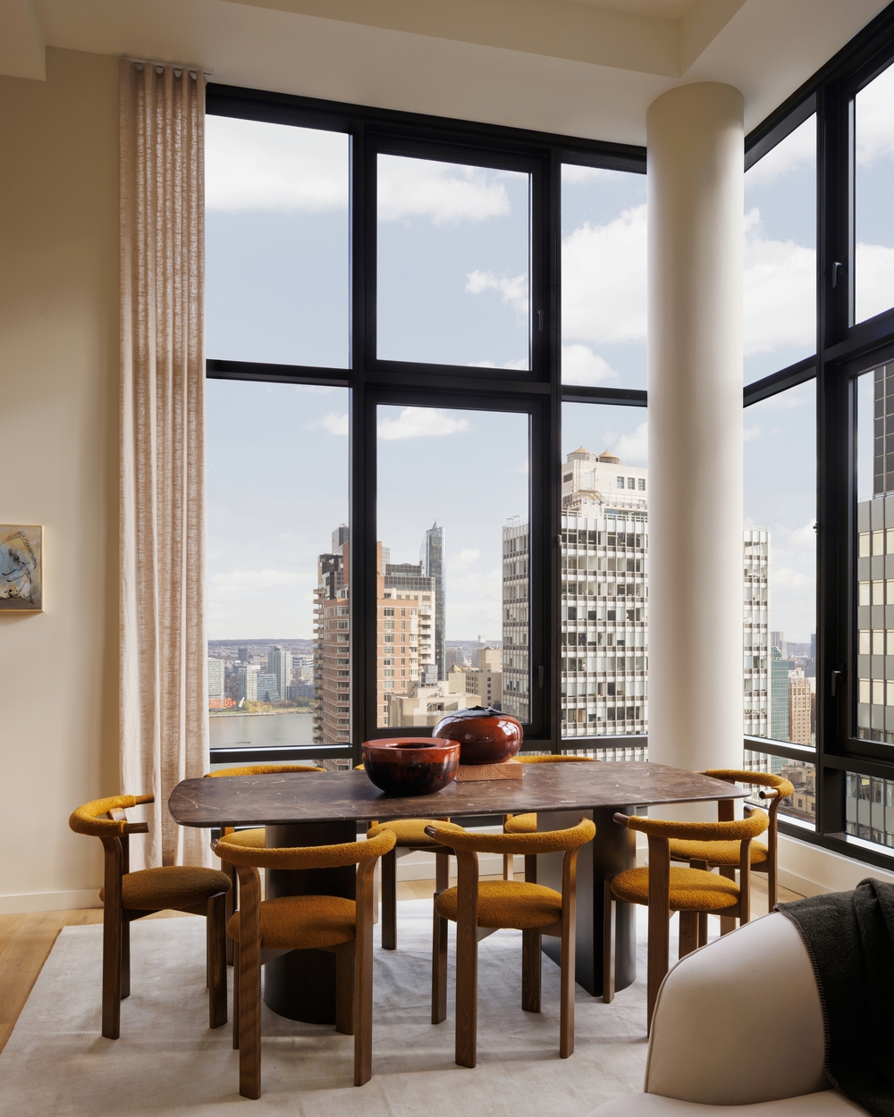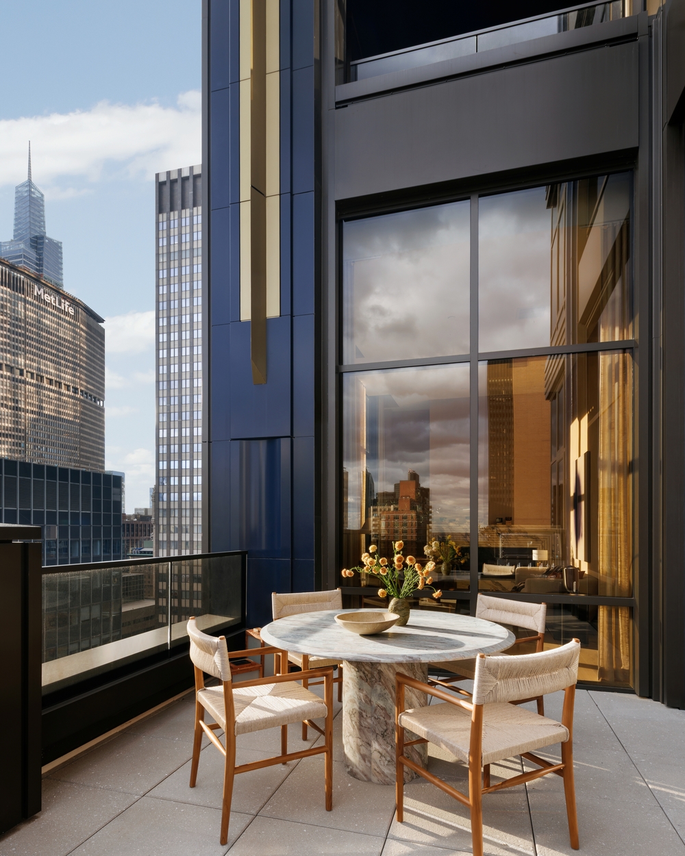Spanning 1,674 square feet with 15-foot ceilings, the penthouse opens onto a sequence of vistas that sweep across Manhattan. From the Chrysler Building to the East River and the newly completed JPMorgan Chase Tower, each view becomes an integral part of the living experience, transforming the skyline into a constantly evolving artwork.