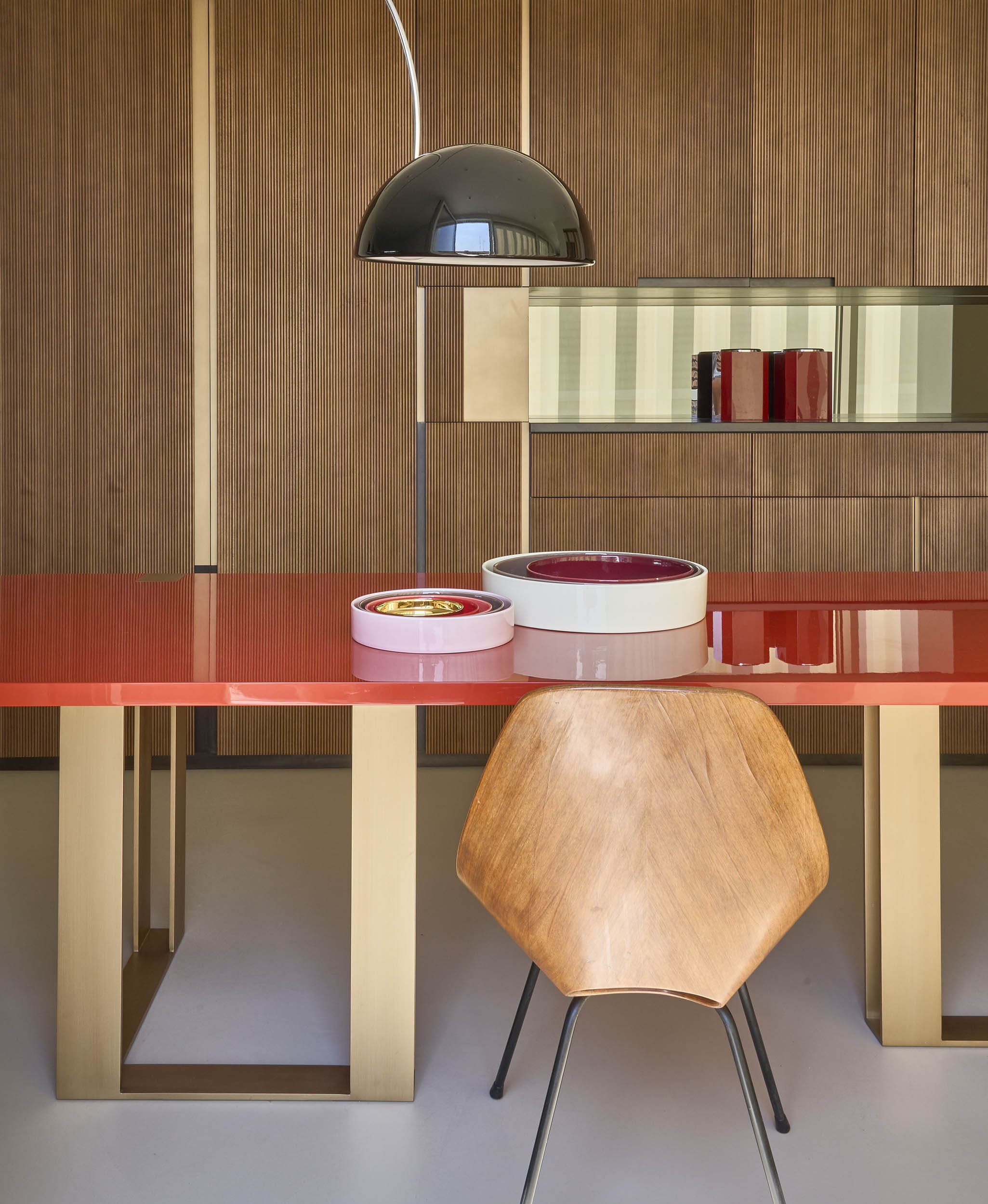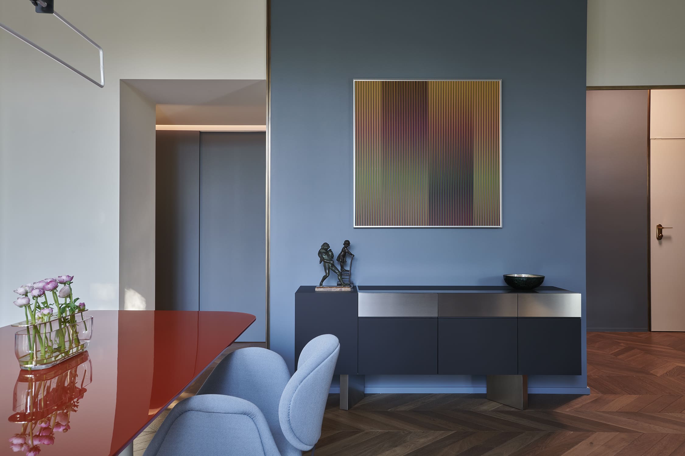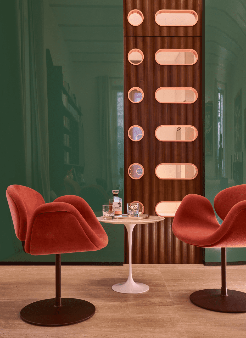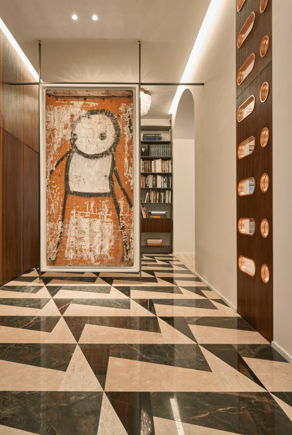 The deep renovation of a historic building in the heart of Milan has given rise to Time Capsule, an entirely tailor-made project. Among the references are the design of Piero Portaluppi, the modernism of Jean Prouvé and the futuristic lines of the Space Age. The entrance with a geometric floor pattern was designed by the studio with a palette of materials and colors given by the union of four marbles: Burgundy green, Perlino pink, Sahara Noir and light Travertine. The kitchen – hence the name chosen for the project – was designed as an architecture within the architecture. It is a curved capsule covered in shiny green polyester that recalls the shapes of a spaceship. In fact, through the portholes of the doors, the living room, the kitchen and the entrance are perceived as part of a single visual experience that seems to come from the future. The design of the furniture and finishes, all strictly tailormade, is characterized by metal elements in copper and iron, combined with cannulated wood. To complete the Time Capsule project, we find a collection consisting of modern and street art pieces.