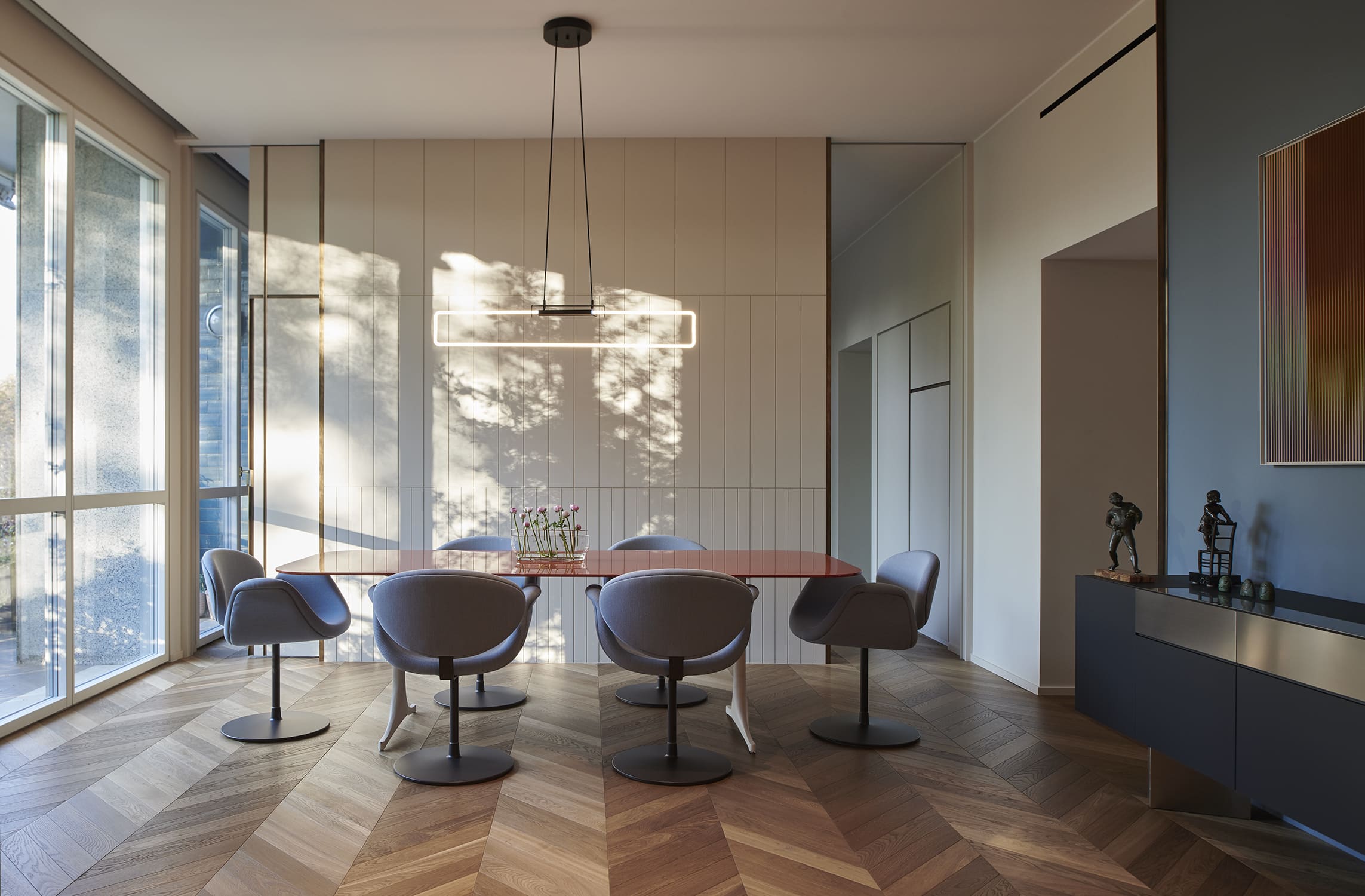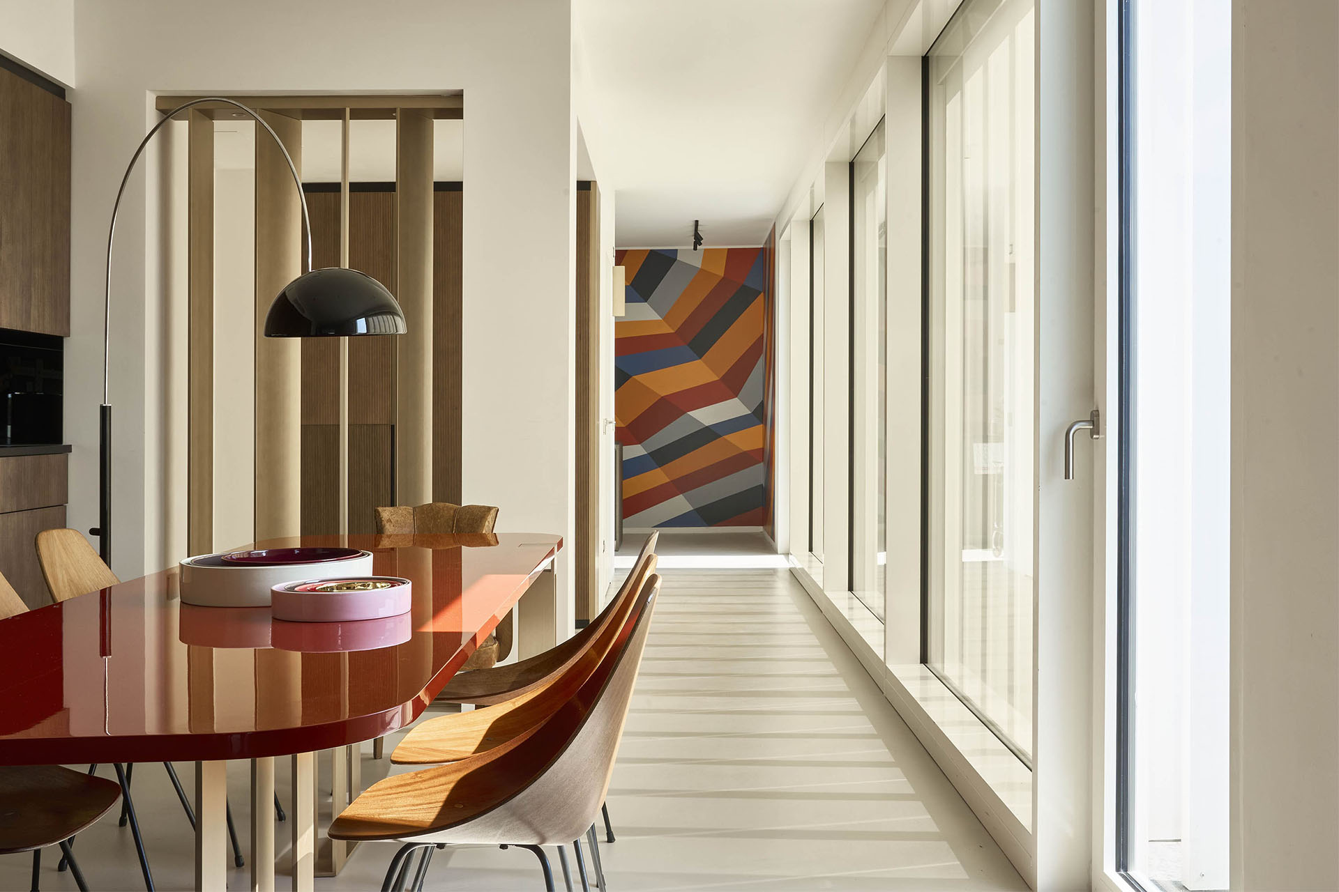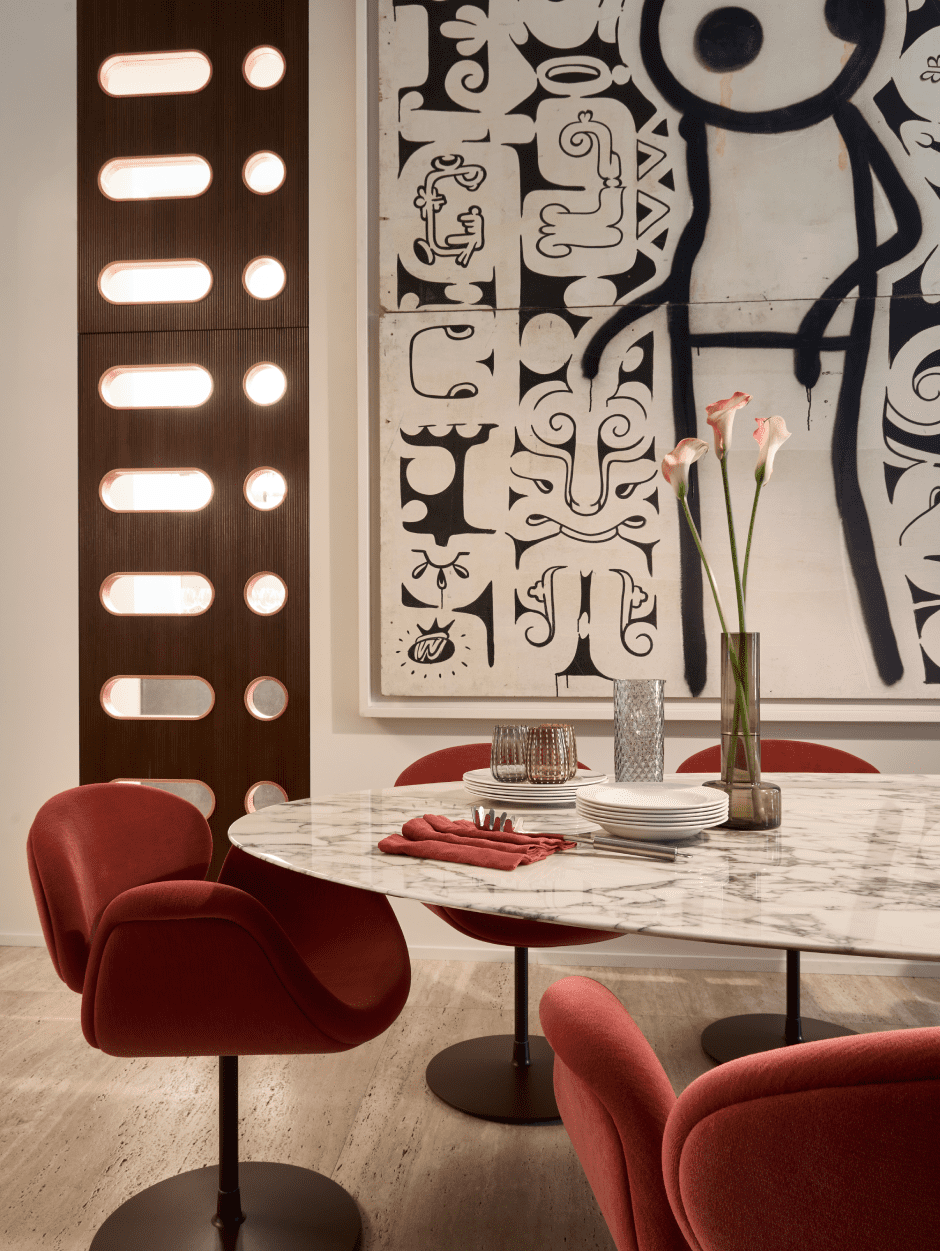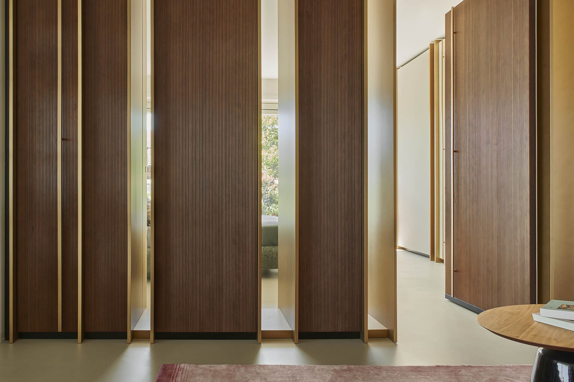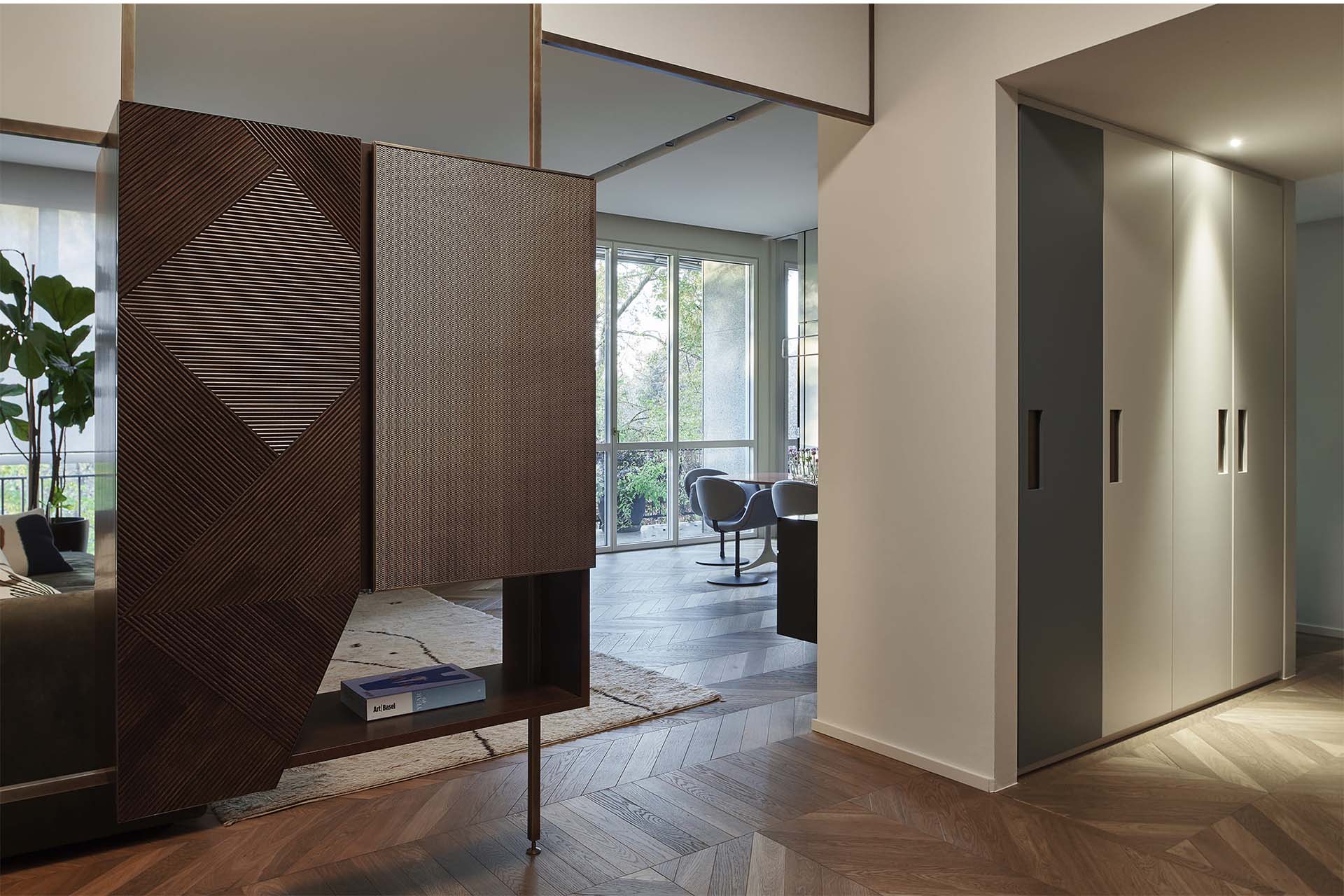 The deep renovation of a historic building in the heart of Milan has given rise to Time Capsule, an entirely tailor-made project. Among the references are the design of Piero Portaluppi, the modernism of Jean Prouvé and the futuristic lines of the Space Age. The entrance with a geometric floor pattern was designed by the studio with a palette of materials and colors given by the union of four marbles: Burgundy green, Perlino pink, Sahara Noir and light Travertine. The kitchen – hence the name chosen for the project – was designed as an architecture within the architecture. It is a curved capsule covered in shiny green polyester that recalls the shapes of a spaceship. In fact, through the portholes of the doors, the living room, the kitchen and the entrance are perceived as part of a single visual experience that seems to come from the future. The design of the furniture and finishes, all strictly tailormade, is characterized by metal elements in copper and iron, combined with cannulated wood. To complete the Time Capsule project, we find a collection consisting of modern and street art pieces.