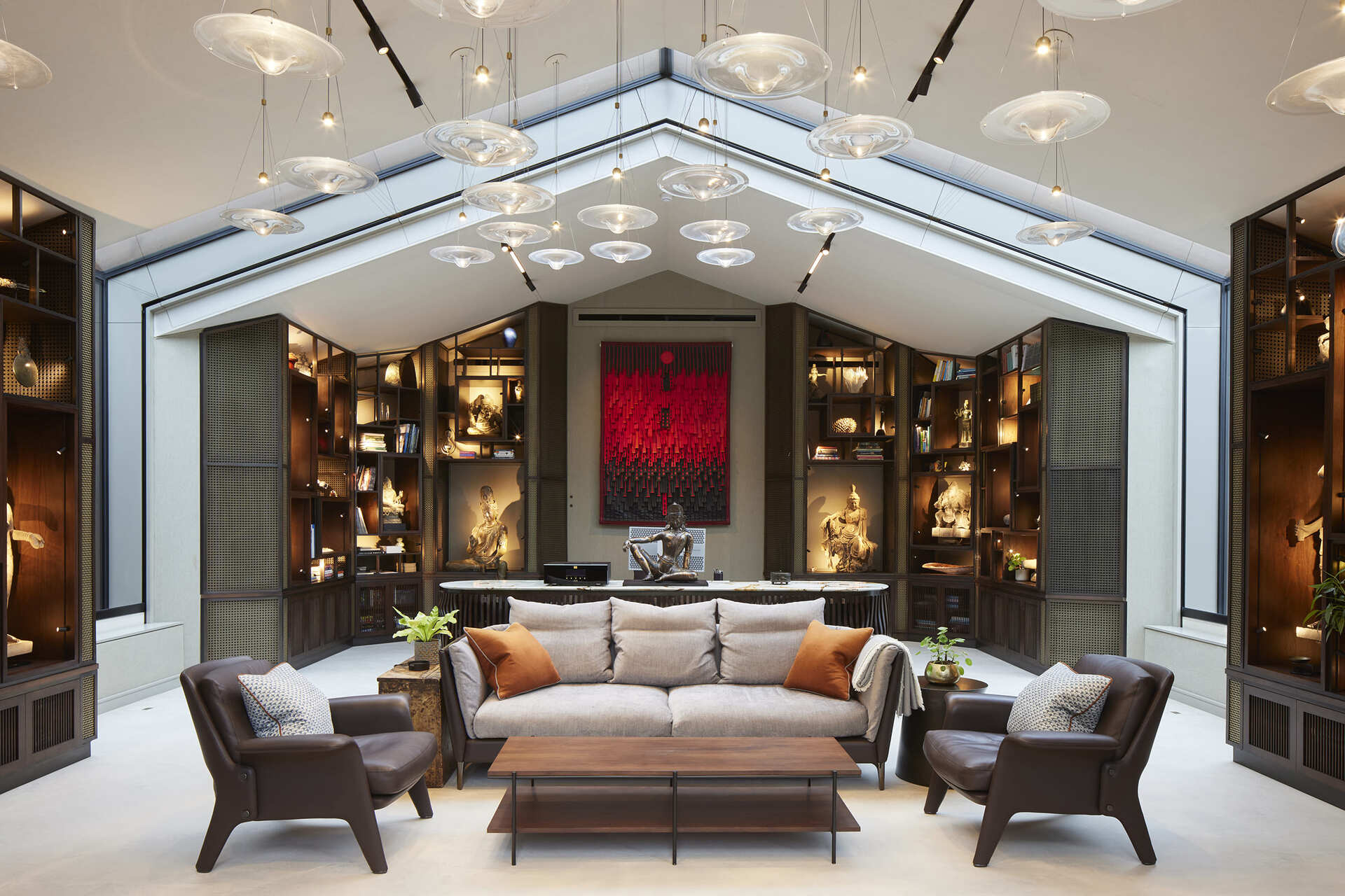 Inside, sound encounters art. Every detail – from bespoke joinery to the discreet integration of technical blinds – has been carefully considered to preserve the acoustic integrity, allowing the music and the client’s collection of artefacts to take centre stage. Material choices are deliberately restrained: a grey microcement floor, backlit metal panels showcasing prized pieces, and a suspended Wonderglass lighting installation that ripples across the floor like water as light plays upon it. Everything is orchestrated to maintain a delicate balance between contemplation and intimacy.