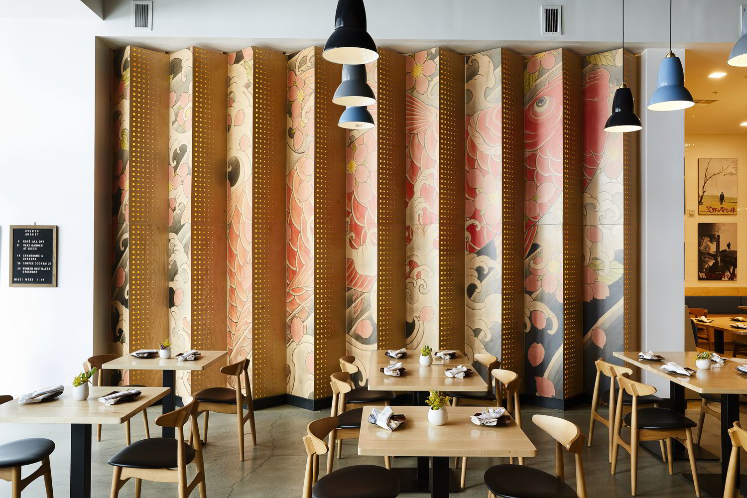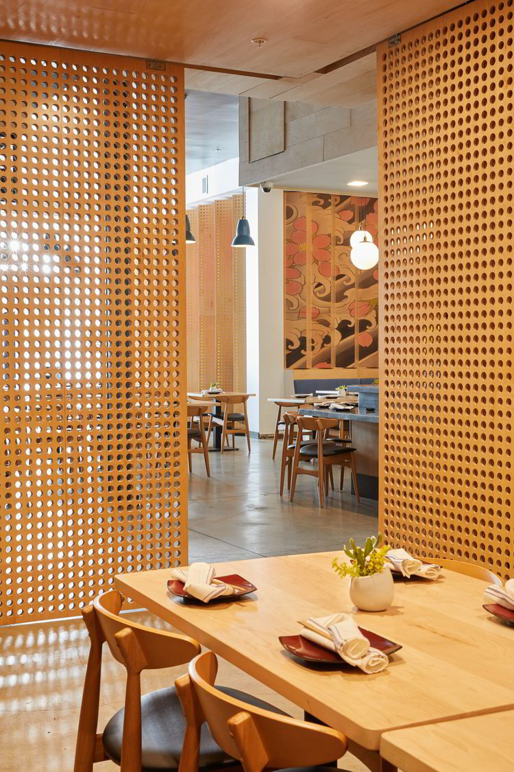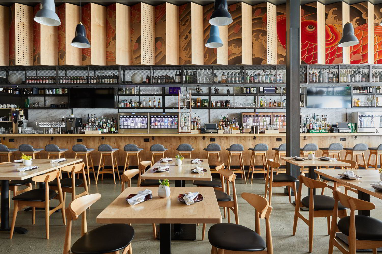 The project for Sake Dojo, a 3.283 square-foot restaurant located at the centre of the Little Tokyo neighbourhood, is one more project by David Wick of Wick Architecture & Design and Andrew Lindley of LAND Design Studio where art and research are at the core. Indeed, that of Sake Dojo is an authentic Japanese-style cuisine with a modern twist and a strong emphasis on craft Japanese sakes, whiskeys, and beers. In order to transfer the cuisine identity into the space design, David and Andrew asked Japanese Tattoo Artist Horifuji and Printer Michael Hill of A ō S A to create lenticular walls of tattoo art and light throughout the space. Thus, a modern Tokyo feeling was given to the restaurant, which comprises a liquor and sake bar, a sushi bar, open table seating and a private dining banquet room. As for the use of furnishing and materials, have been selected an expanded steel liquor cage, sliding perforated plywood panels enclosing the private dining room, and vintage décor pieces, including American movie posters in Japanese, cameras and sake bottles. In short, those by Wick Architecture & Design are always projects other than obvious.