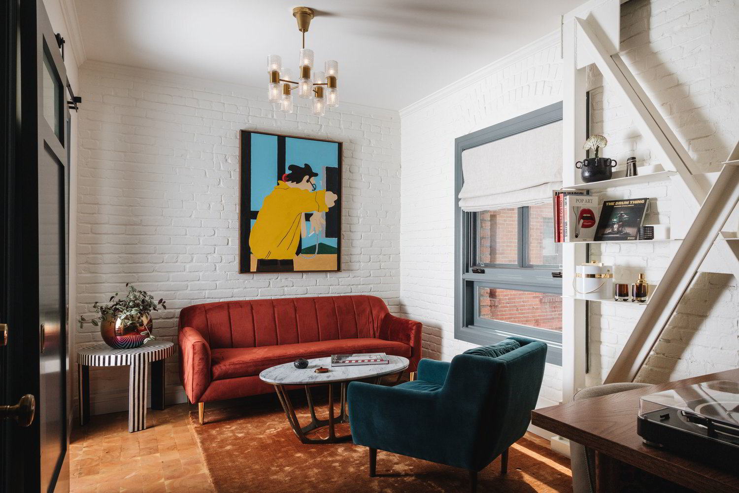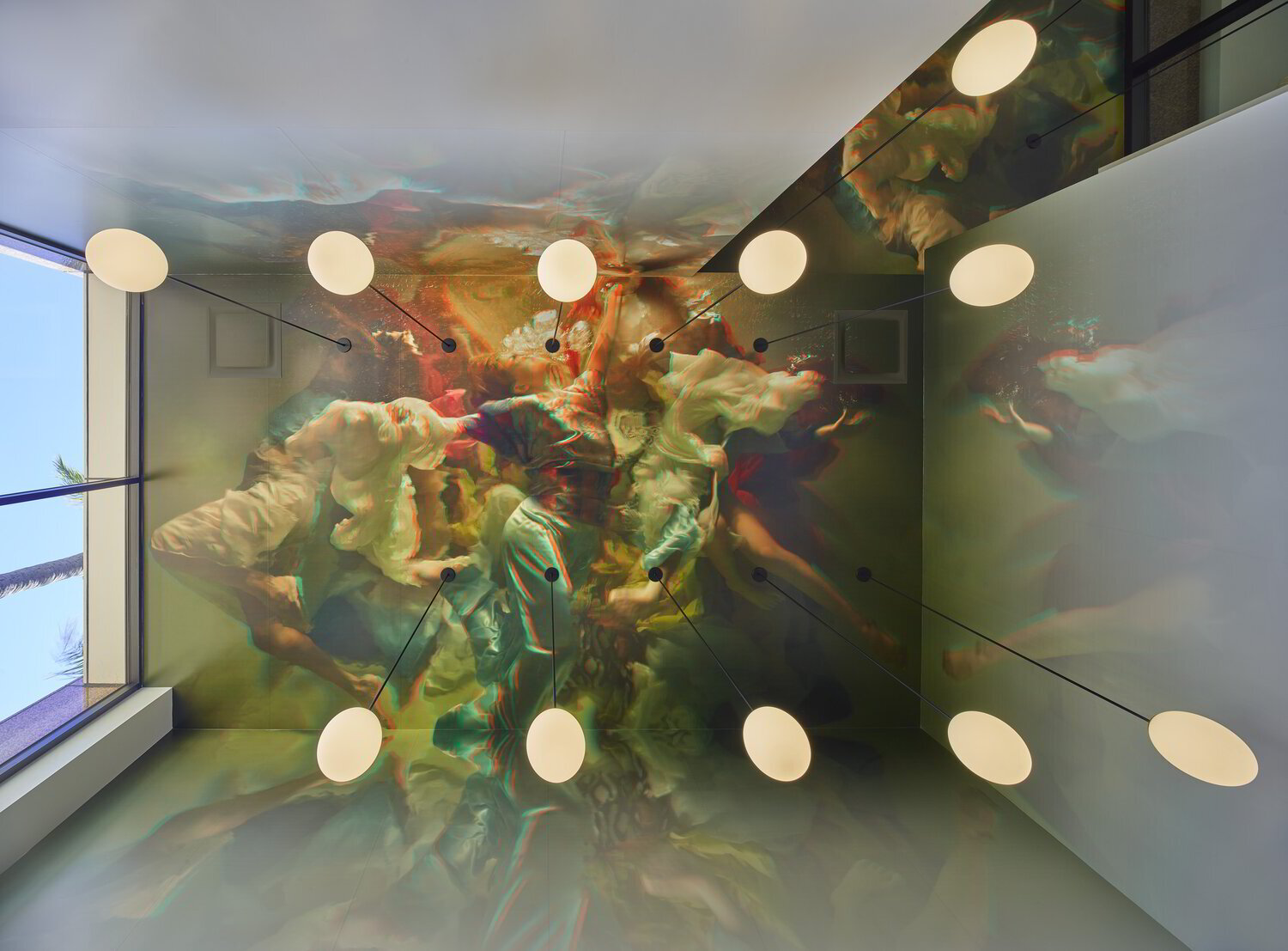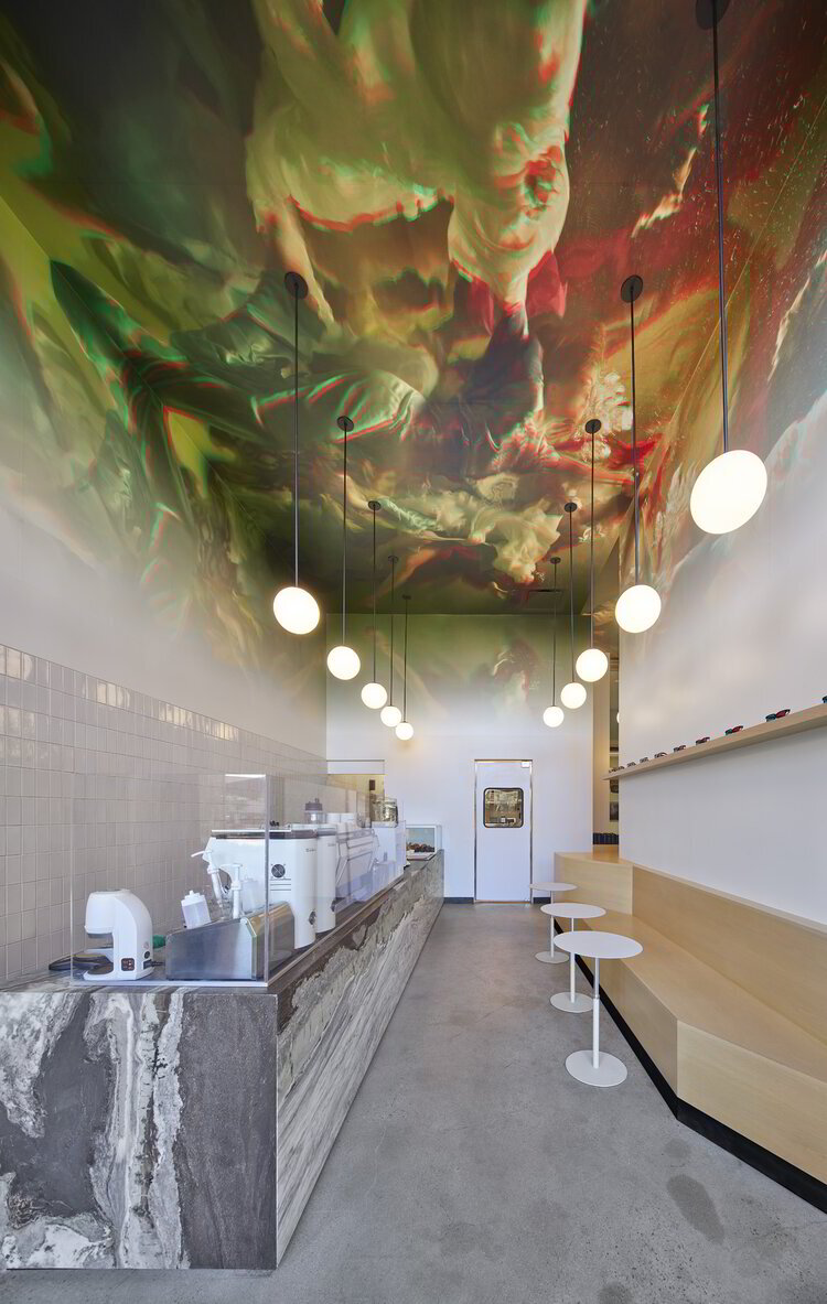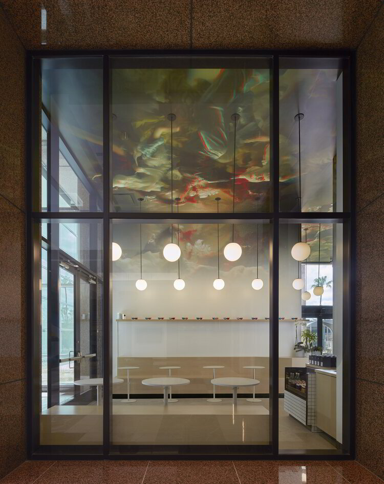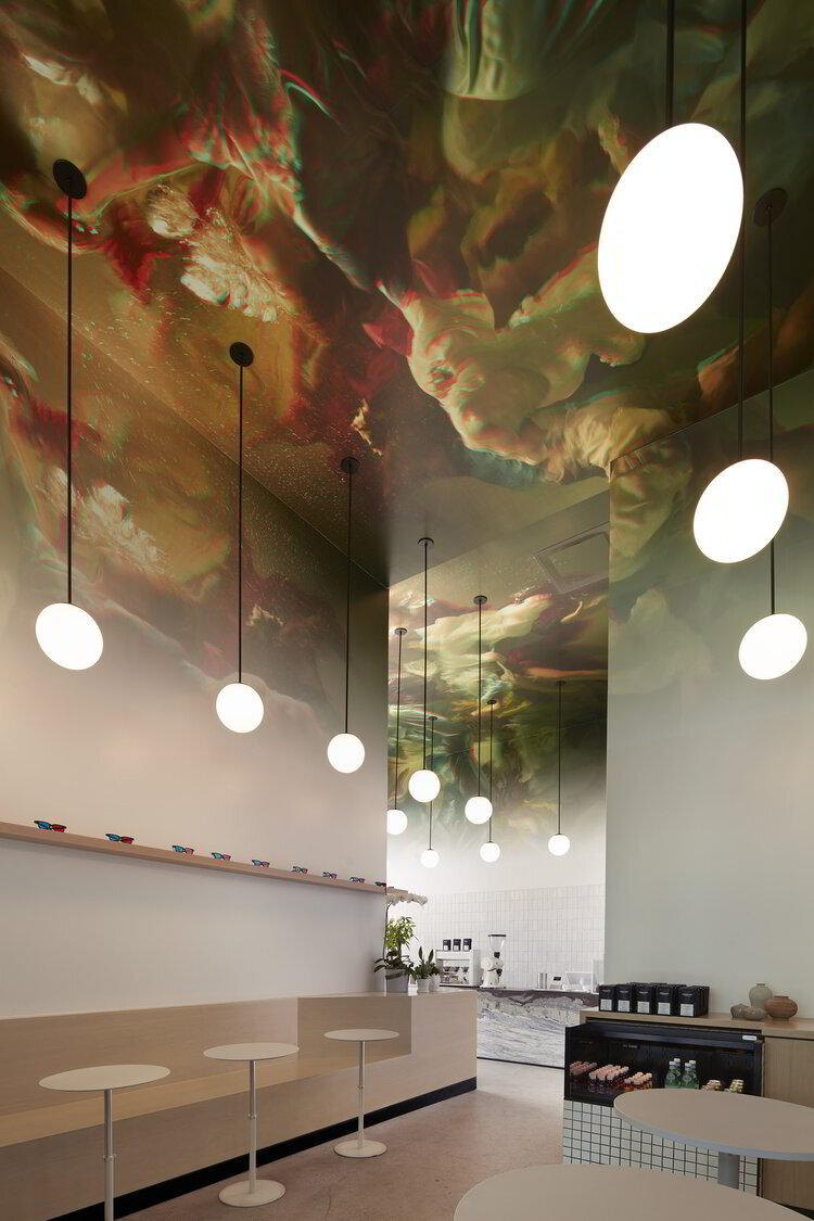 In order to bring the concept to life, the artist Christy Lee Rogers, renowned for her underwater Renaissance and Baroque style photography, was asked to licence a piece of her work, The Reunion of Cathryn Carrie and Jean, to be transferred into 3D. Then, working with a Nashville-based blue printer, Big Visual Group, the design team transferred the art to the ceiling thanks to a remarkable installation process. To enjoy the space’s avant-garde experience to the fullest, 3D glasses were placed on the shelves of the coffee shop, giving access to the visual splendour of the artwork above. Finally, 8 feet above the floor, where the vivid colours of the artwork fades to white, the corners of the L-shaped interiors were provided with lighting fixtures from Andrew Neyer’s Suff® collection for Astro Globe, thus accentuating the space and delineating the minimalist décor below.